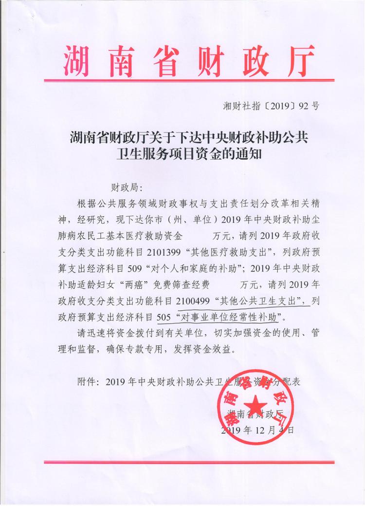 湖南省财政厅关于下达中央财政补助公共卫生服务项目资金的通知
