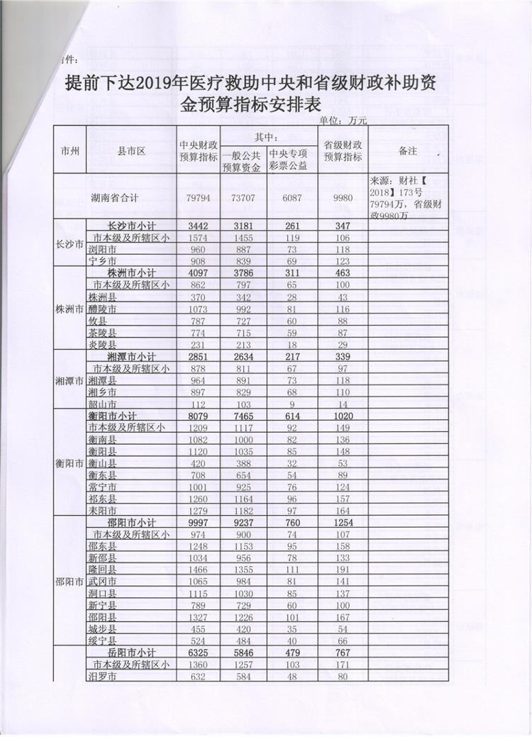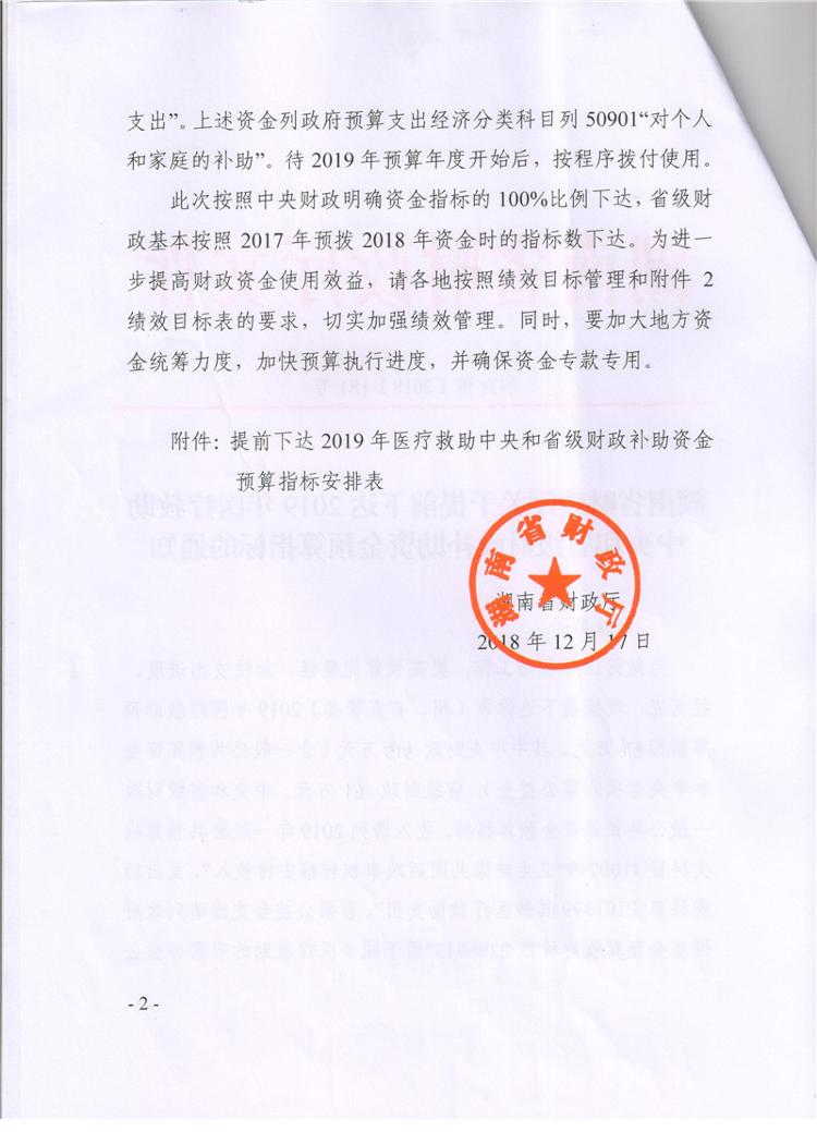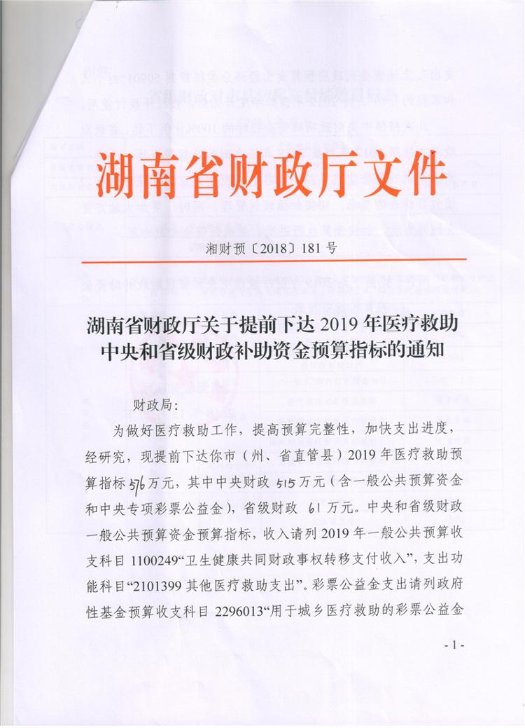 湖南省财政厅关于提前下达2019年医疗救助中央和省级财政补助资金预算指标的通知(湘财预【2018】181号)