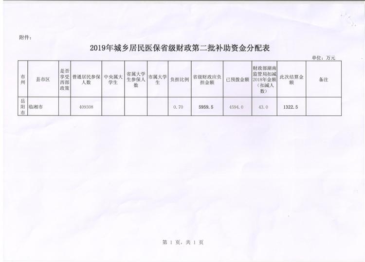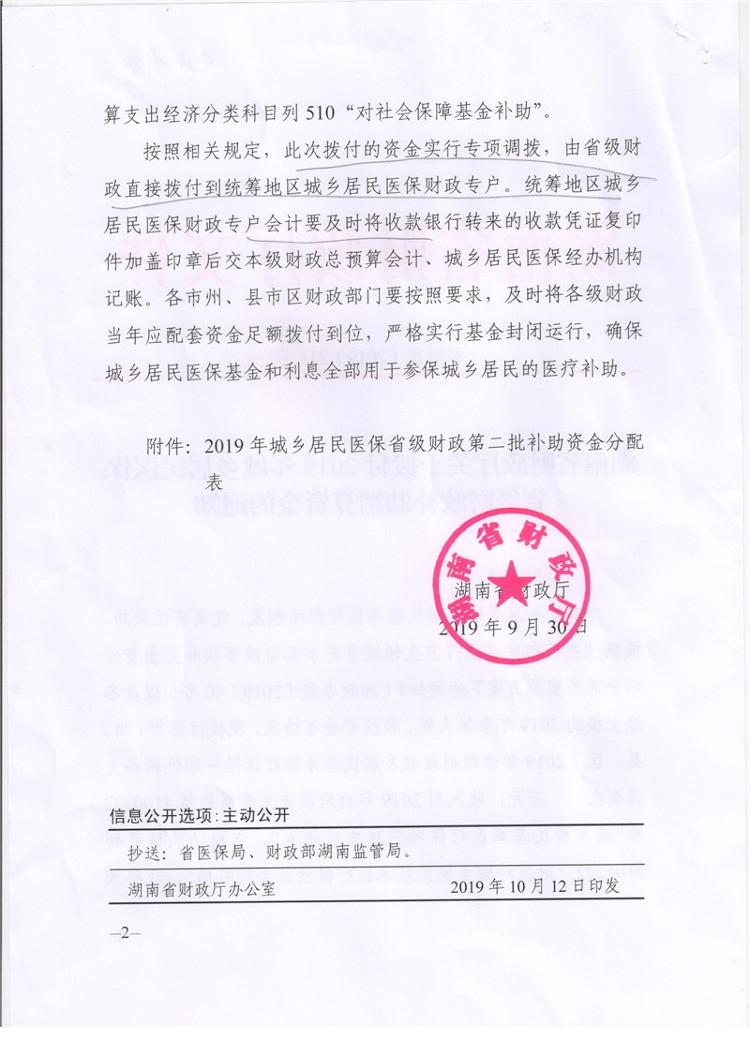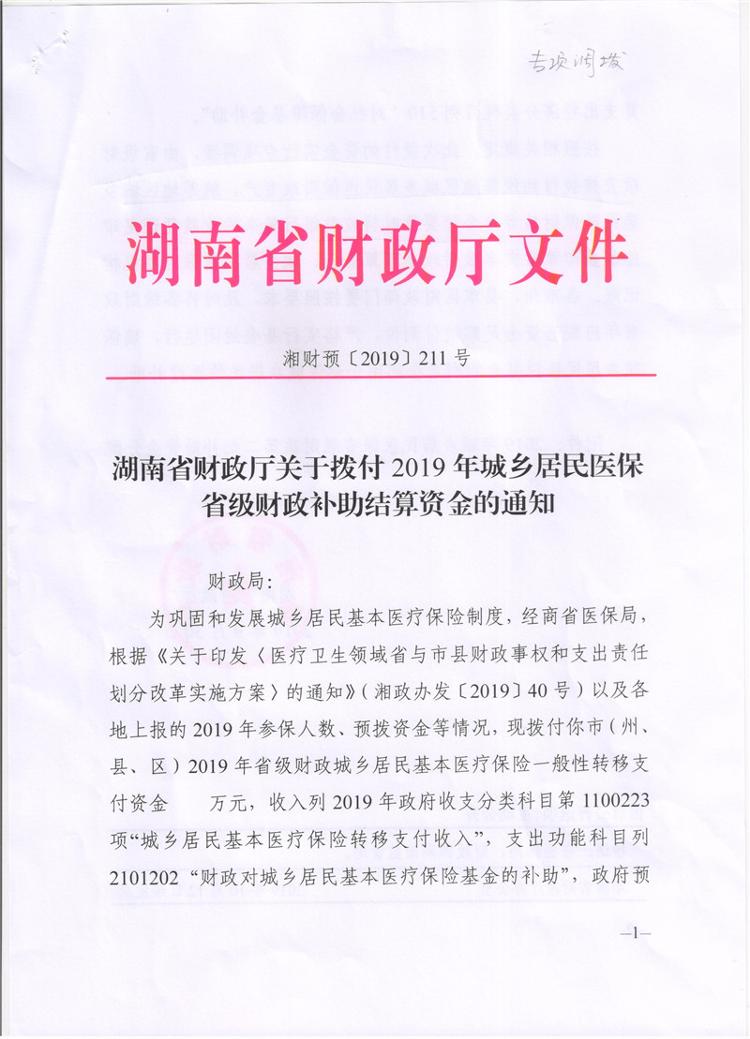 湖南省财政厅关于拨付2019年城乡居民医保省级财政补助结算资金的通知