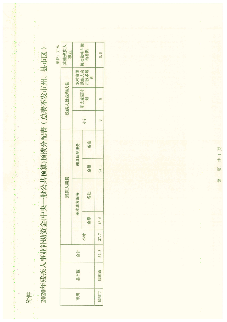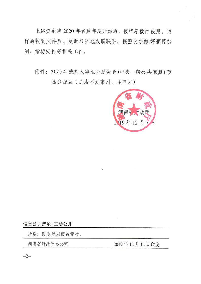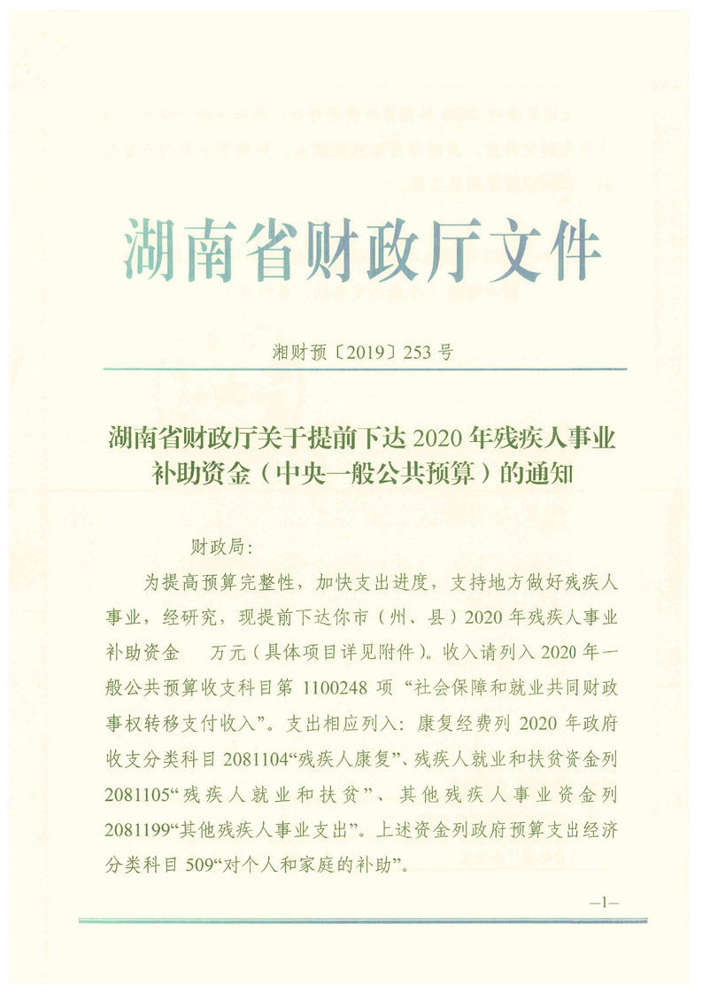 湖南省财政厅关于提前下达2020年残疾人事业补助资金(中央一般公共预算)的通知