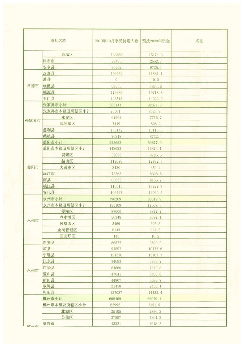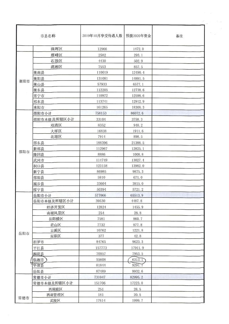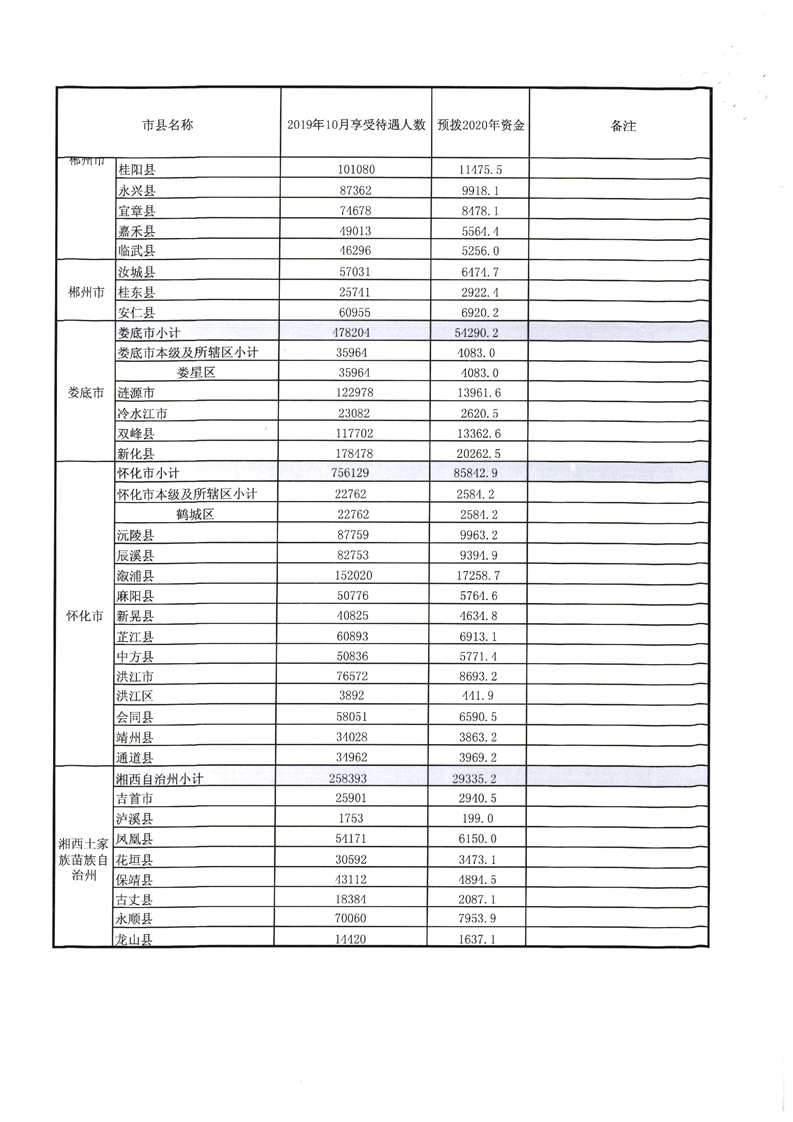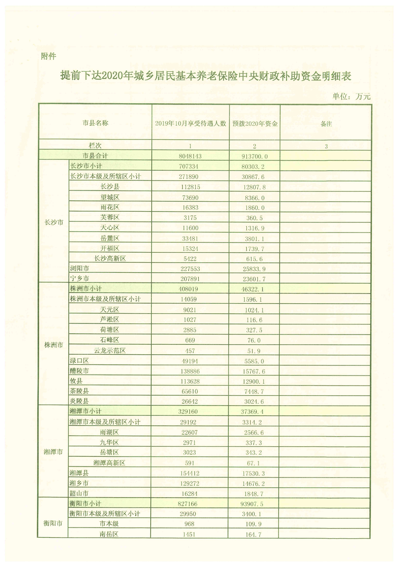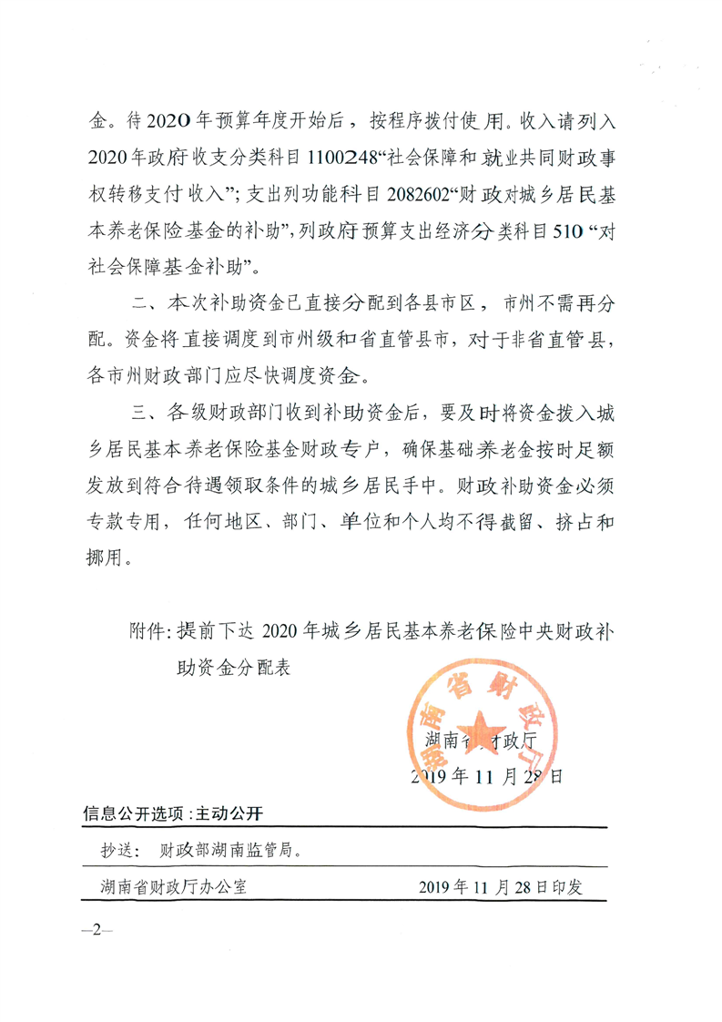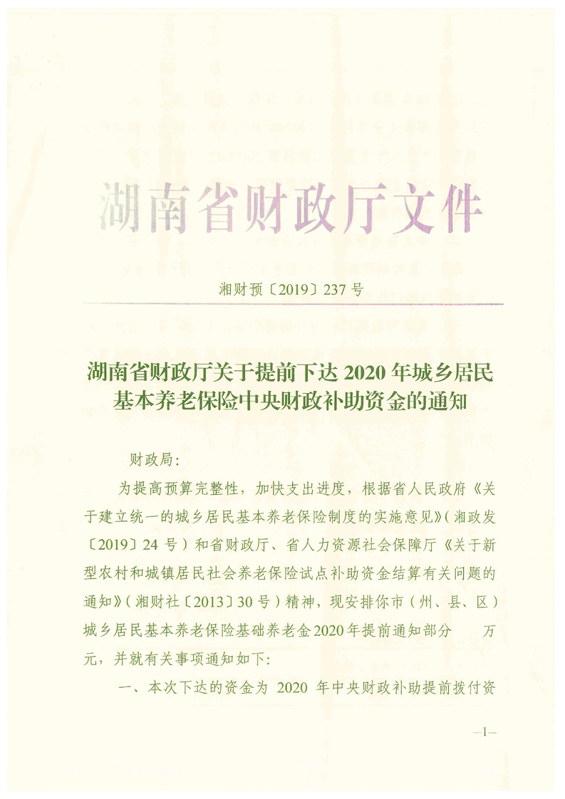 湖南省财政厅关于提前下达2020年城乡居民基本养老保险中央财政补助资金的通知