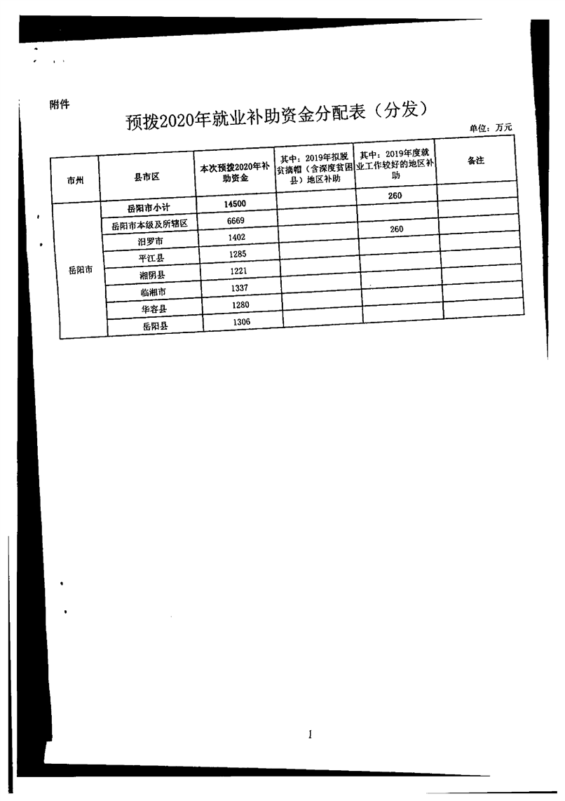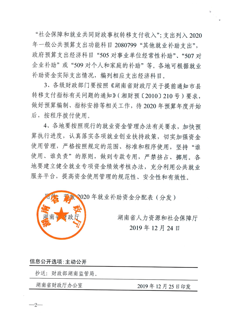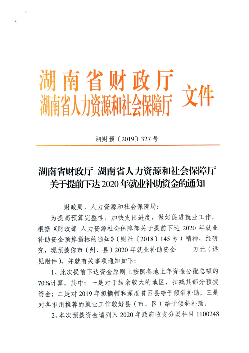湖南省财政厅湖南省人力资源和社会保障厅关于提前下达2020年就业补助资金的通知