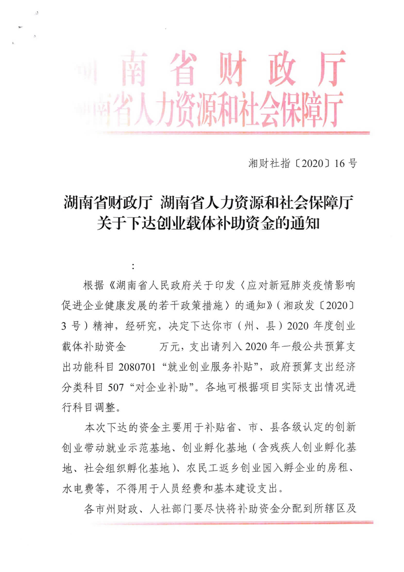 湖南省财政厅湖南省人力资源和社会保障厅关于提前下达创业载体补助资金的通知