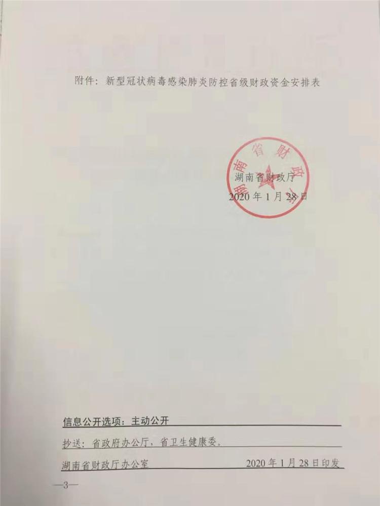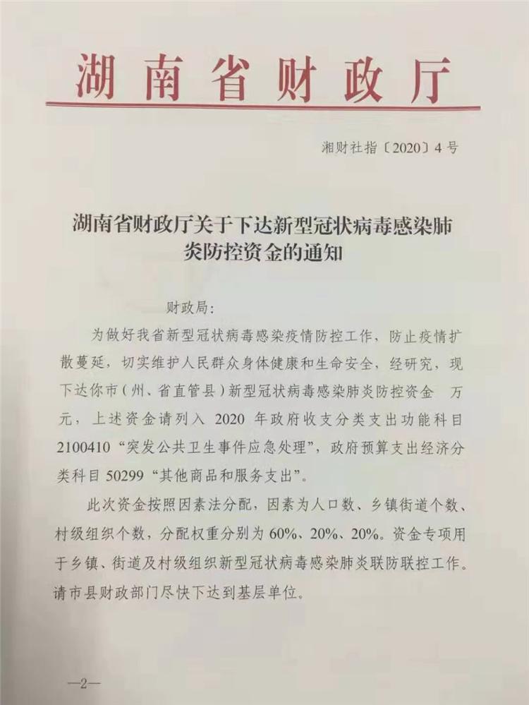 湖南省财政厅关于下达新型冠状病毒感染肺炎防控资金的通知