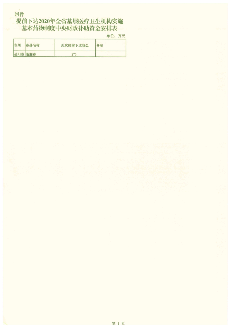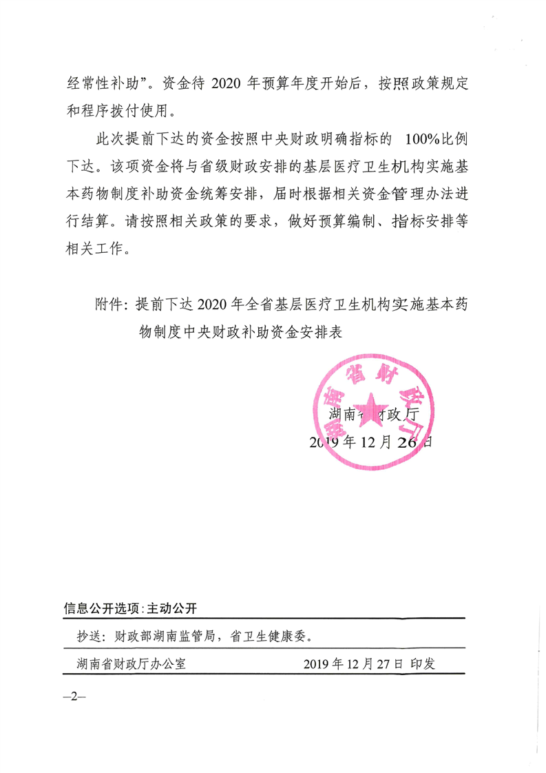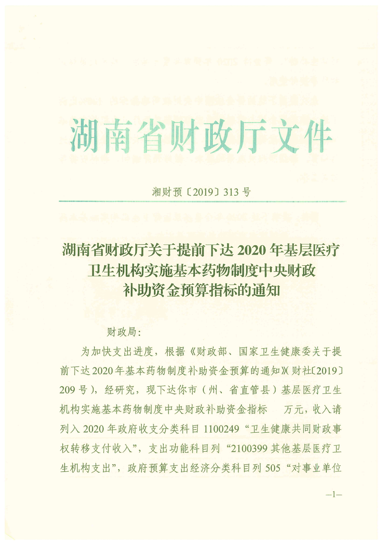 湖南省财政厅关于提前下达2020年基层医疗卫生机构实施基本药物制度中央财政补助资金预算指标的通知