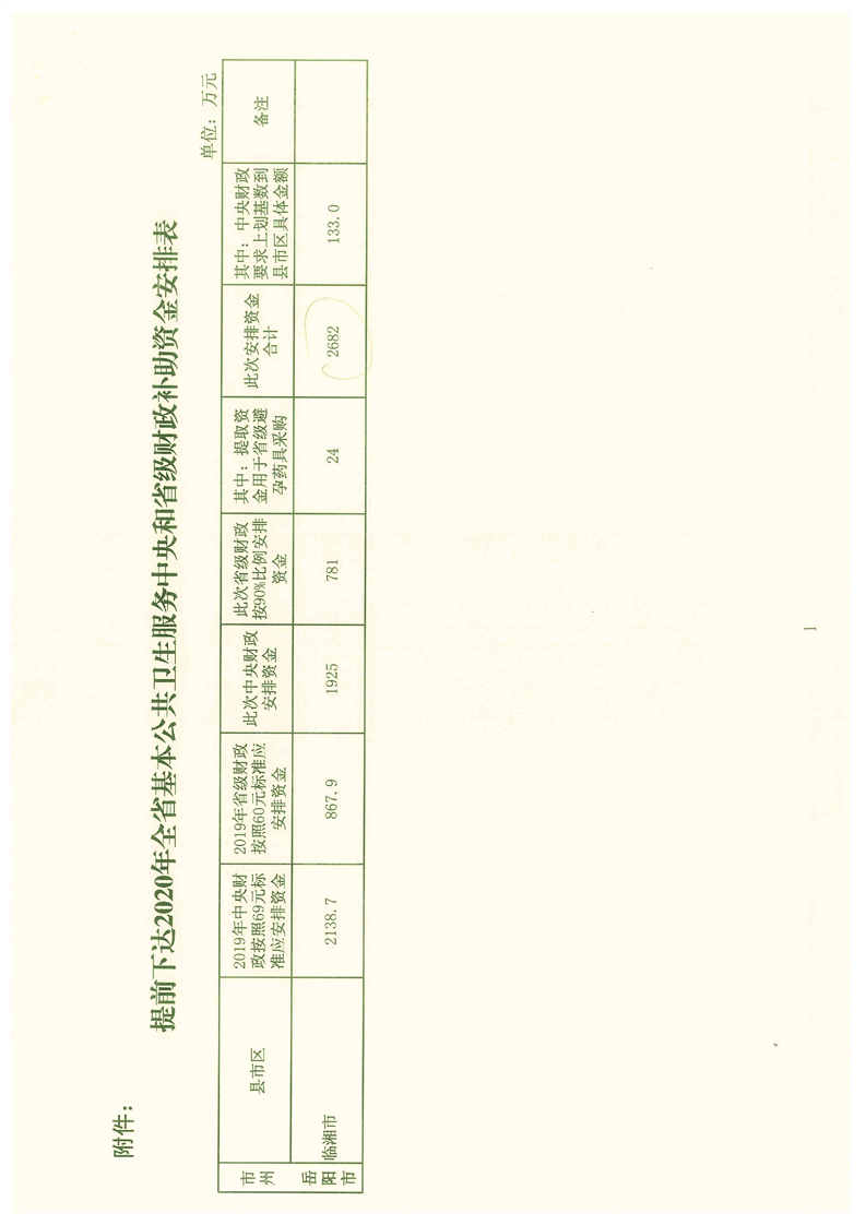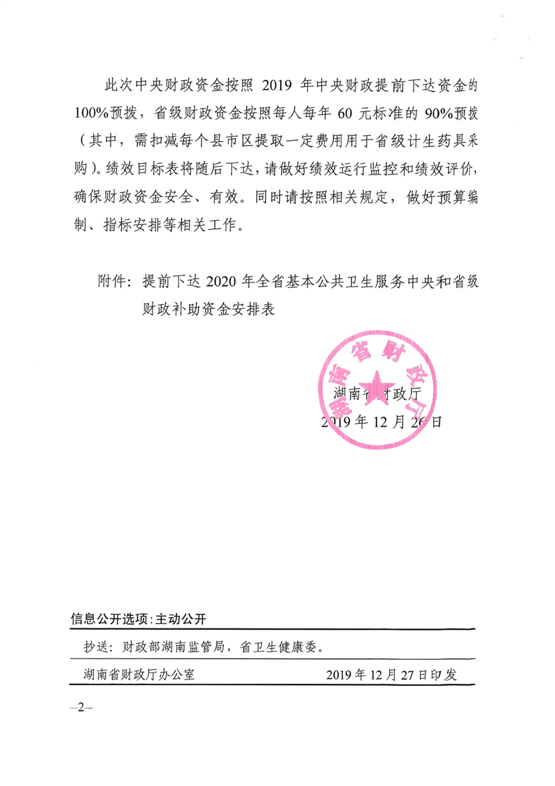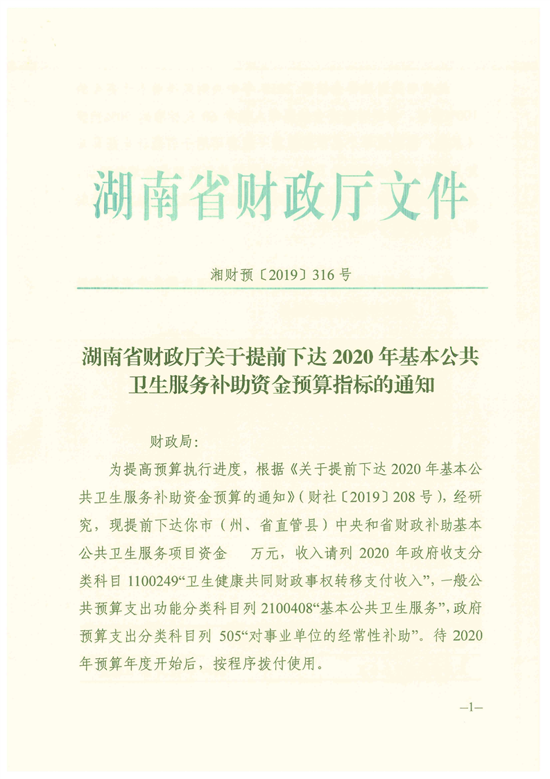 湖南省财政厅关于提前下达2020年基本公共卫生服务补助资金预算指标的通知