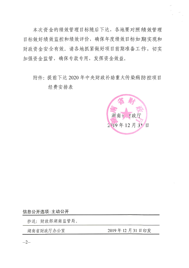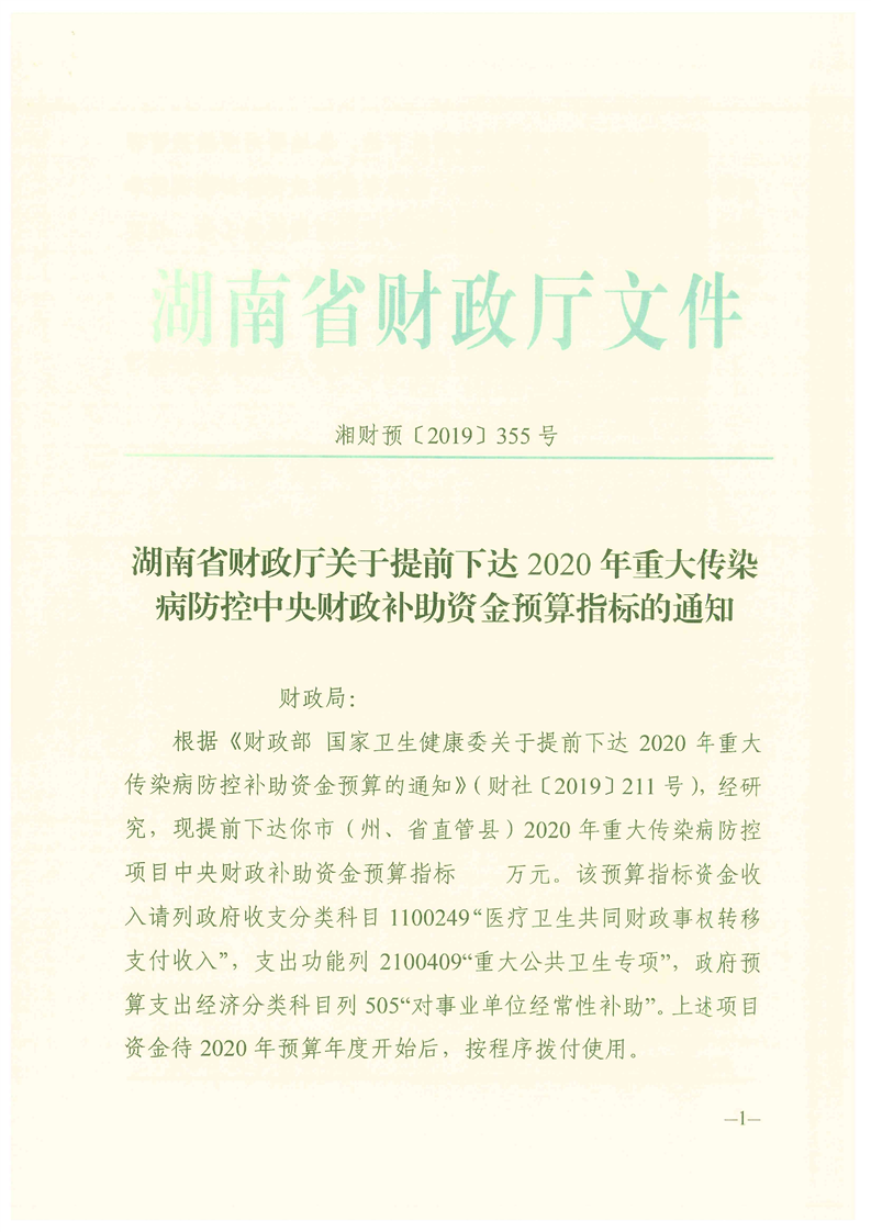 湖南省财政厅关于提前下达2020年重大传染病防控中央财政补助资金预算指标的通知