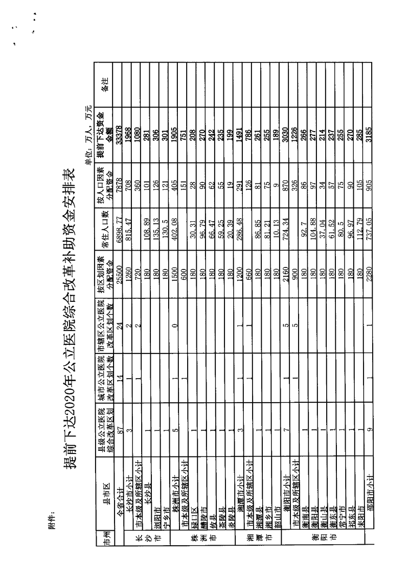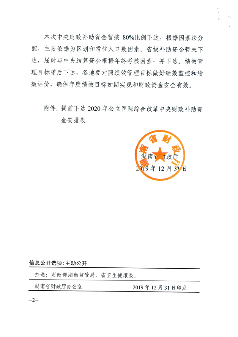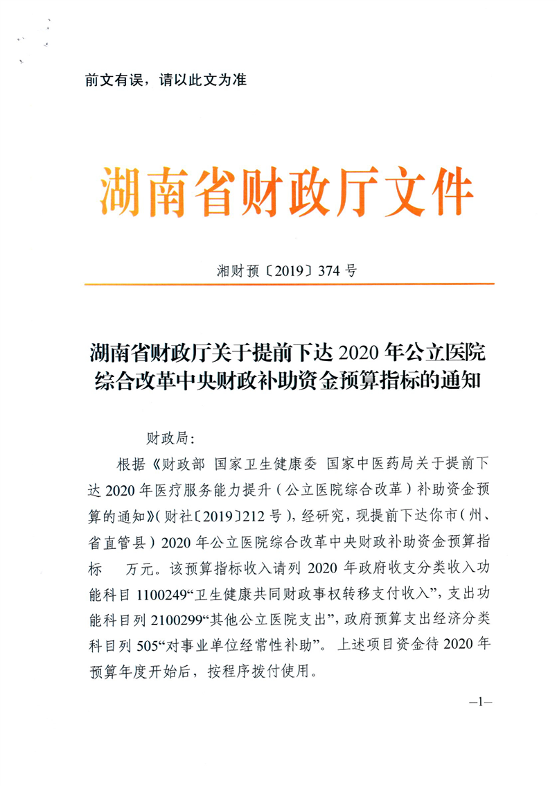 湖南省财政厅关于提前下达2020年公共医院综合改革中央财政补助资金预算指标的通知
