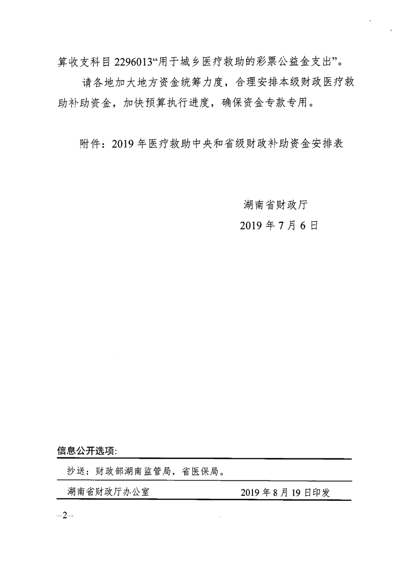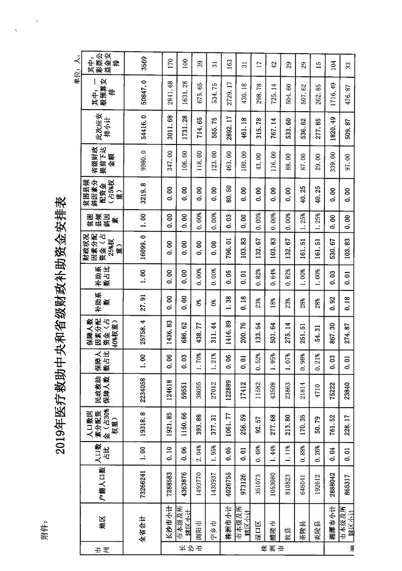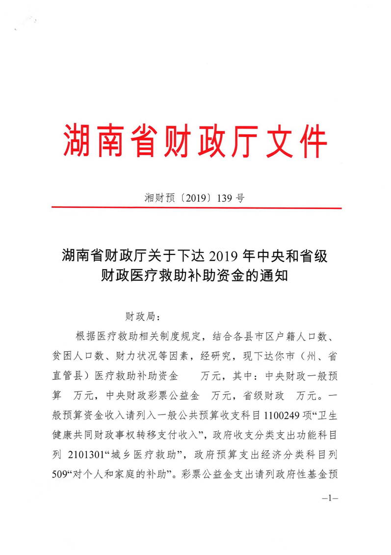 湖南省财政厅关于下达2019年中央和省级财政医疗救助补助资金的通知