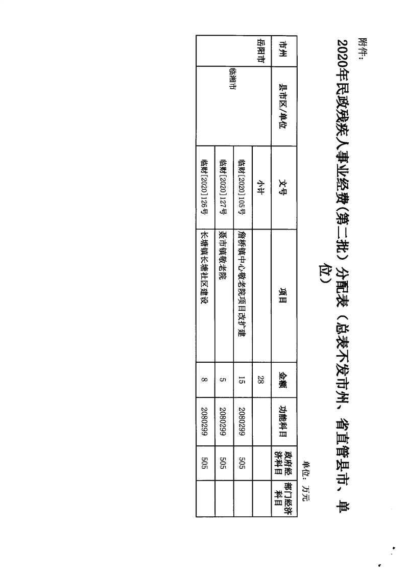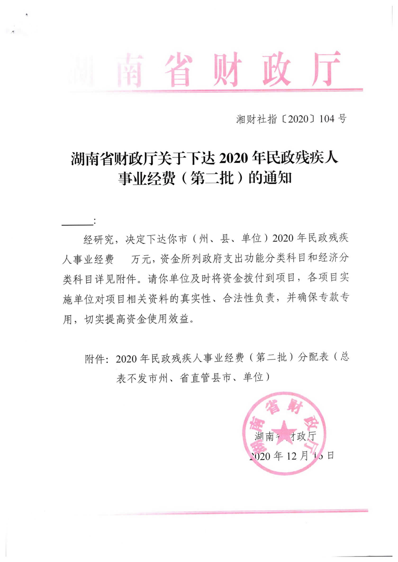 湖南省财政厅关于下达2020年民政残疾人事业经费(第二批)的通知