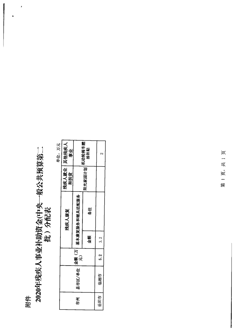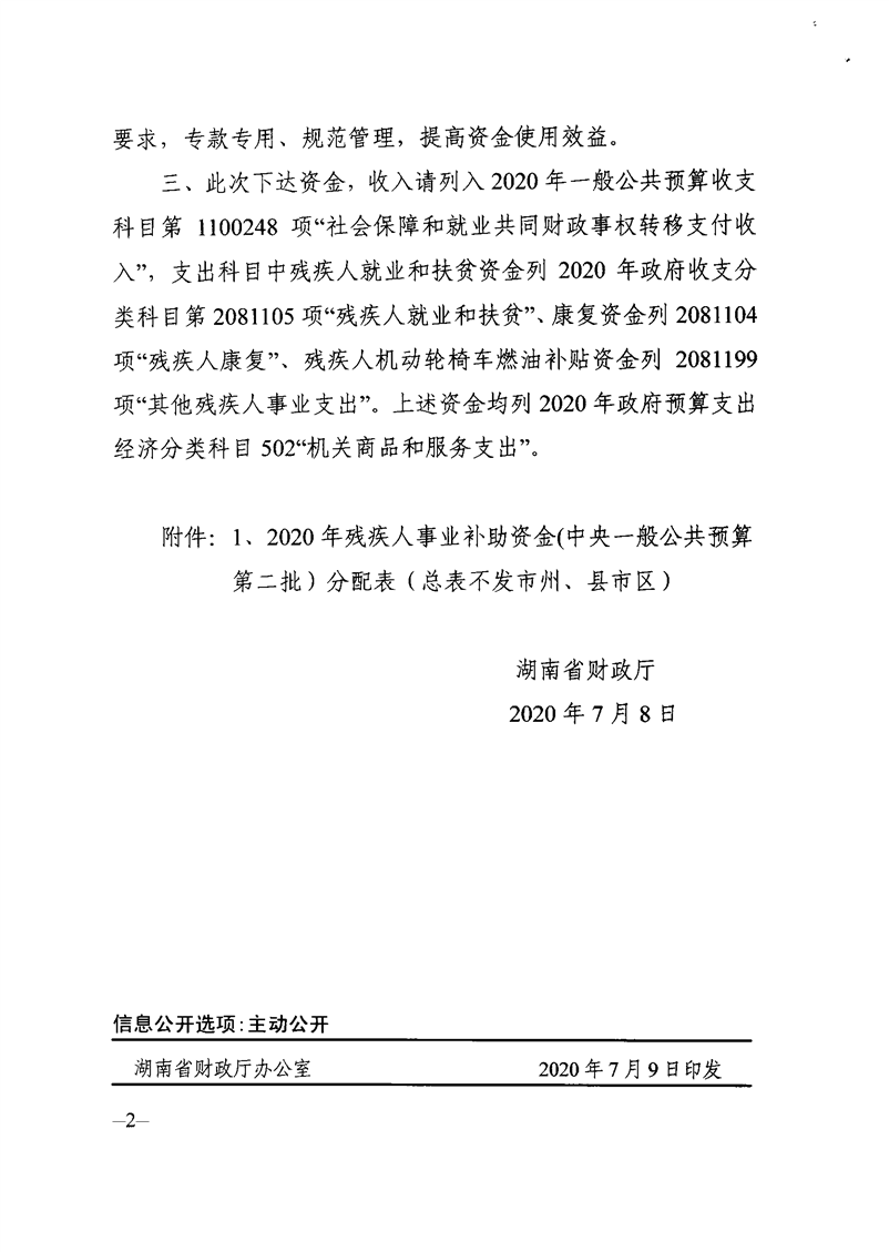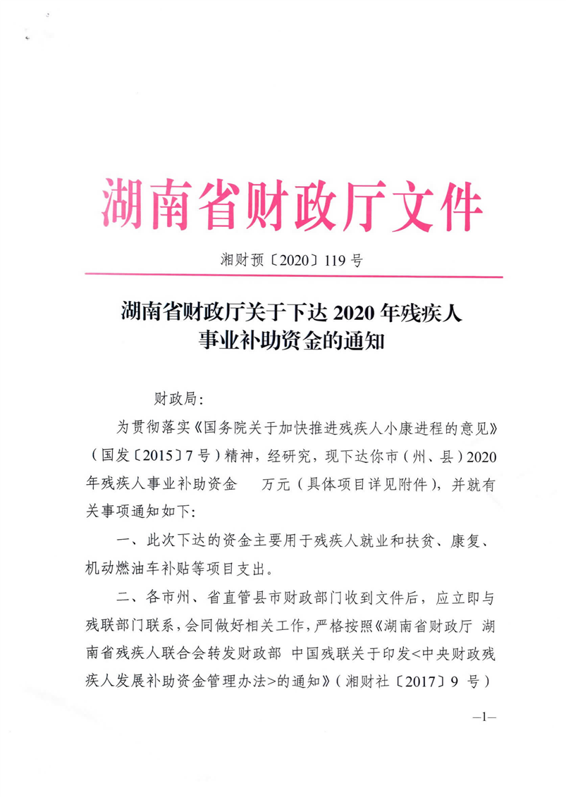 湖南省财政厅关于下达2020年残疾人事业补助资金的通知