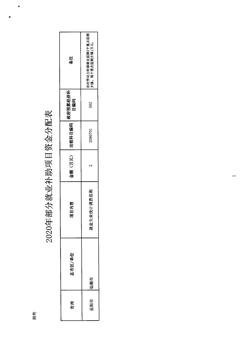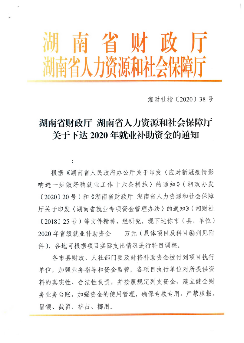 湖南省财政厅 湖南省人力资源和社会保障厅关于下达2020年就业补助资金的通知
