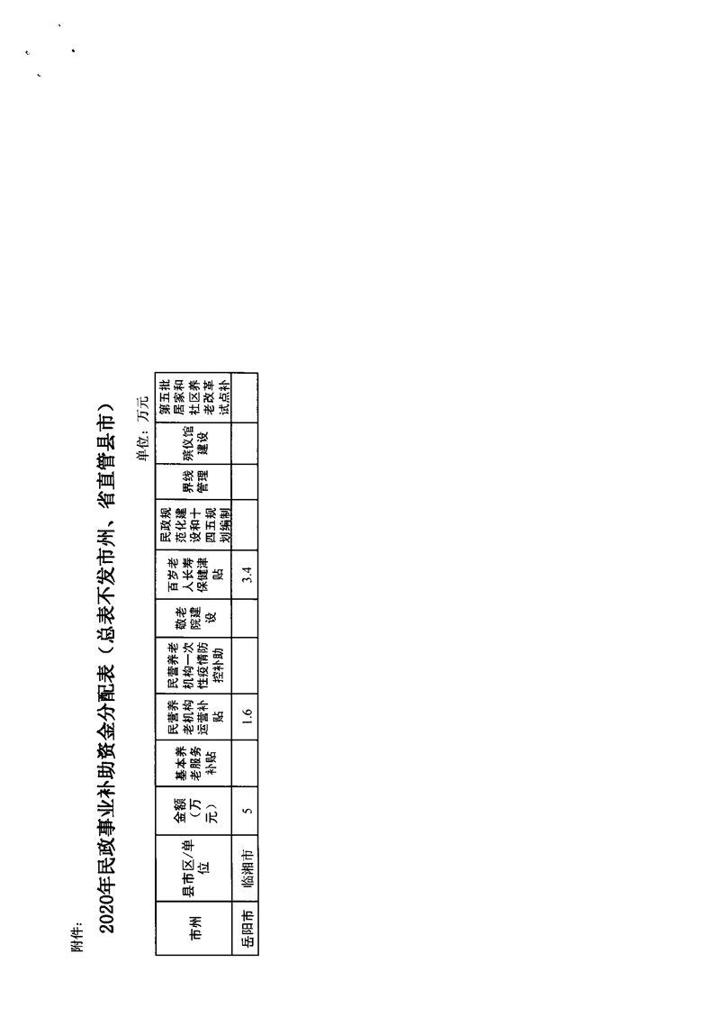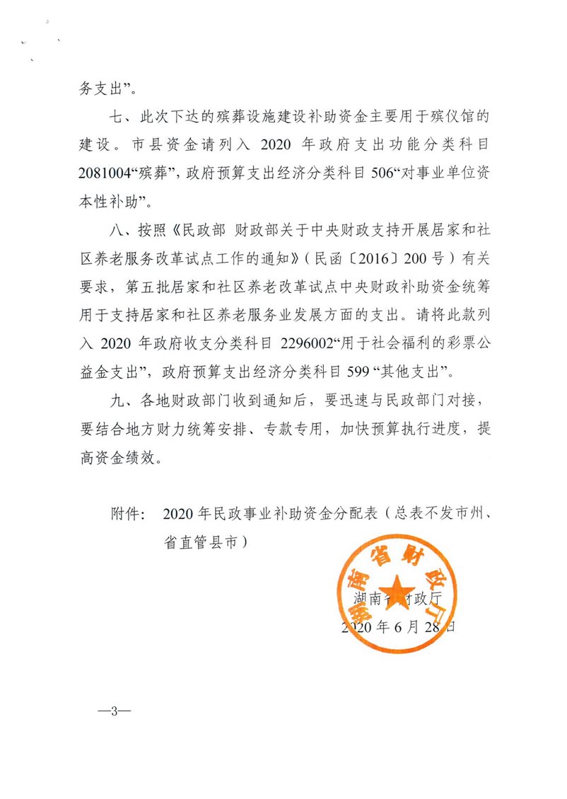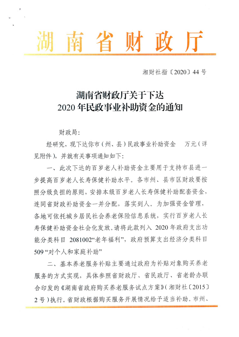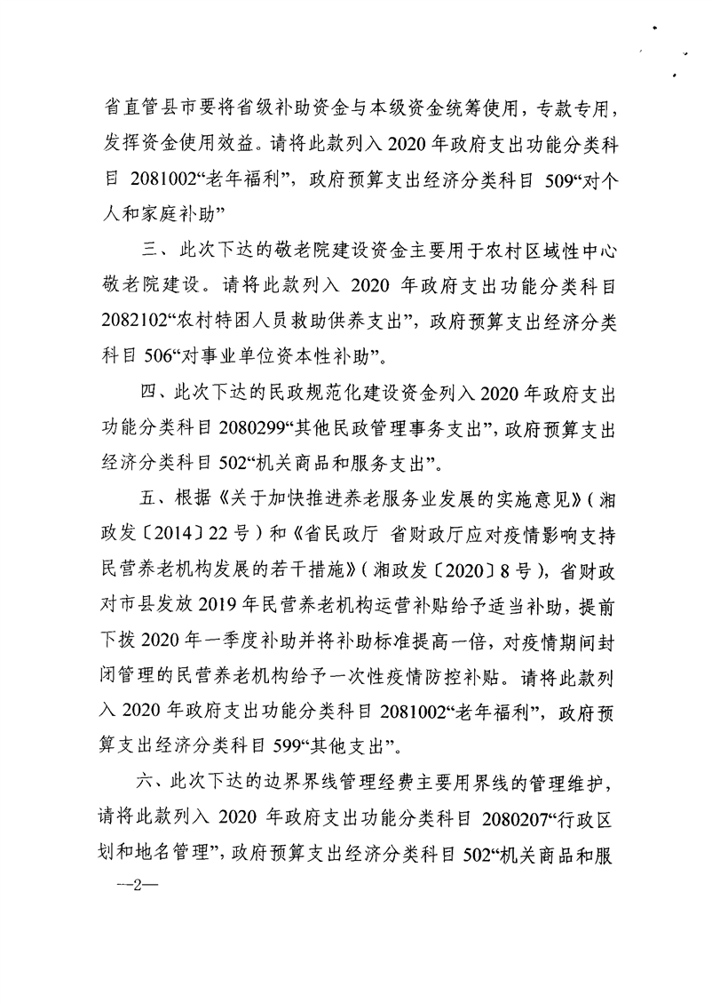 湖南省财政厅关于下达2020年民政事业补助资金的通知