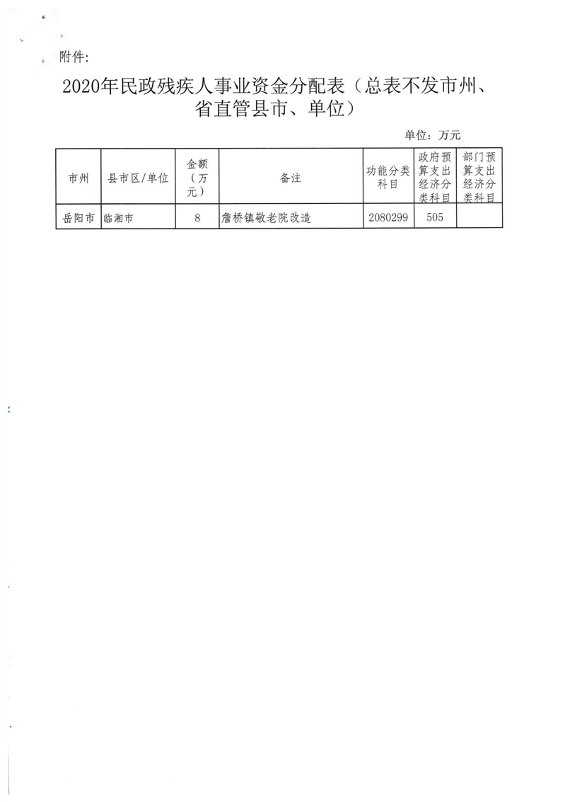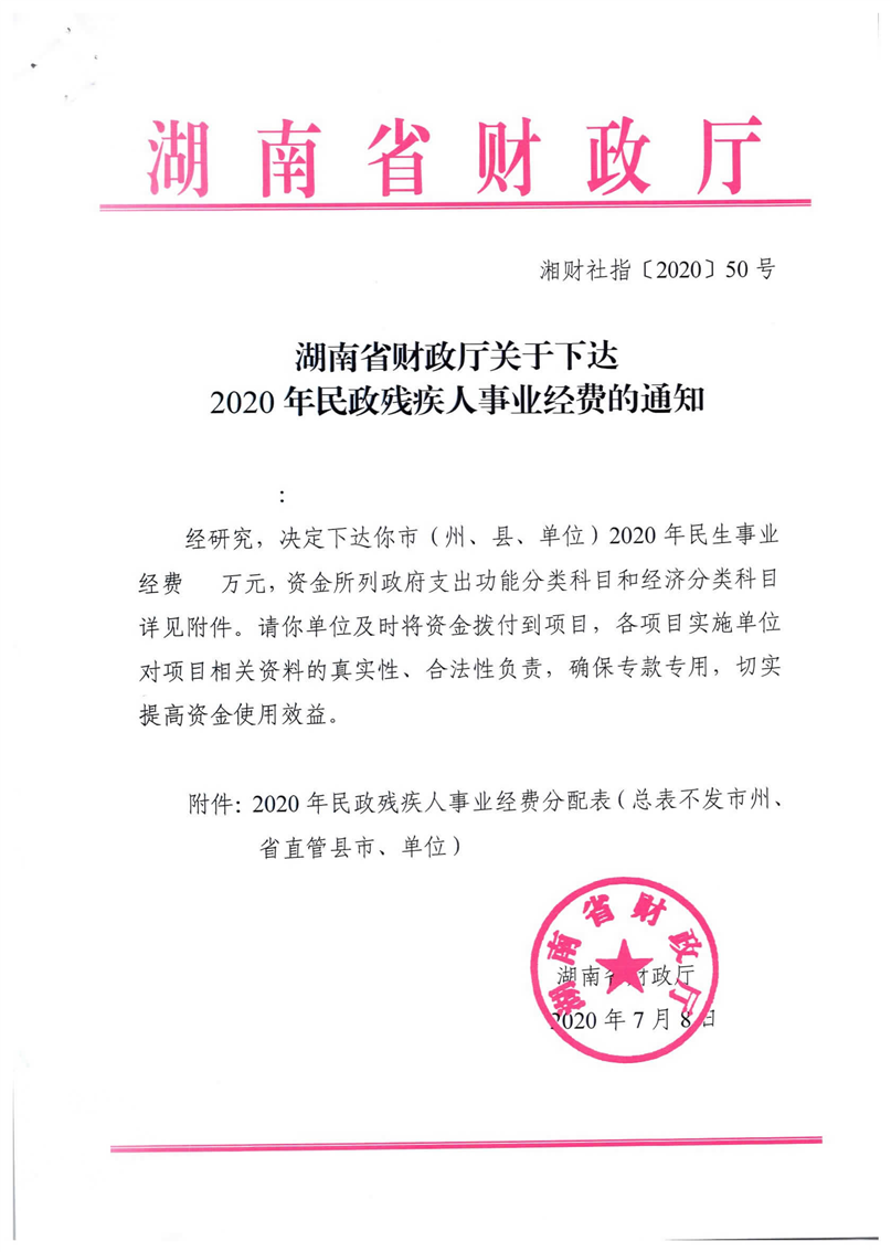 湖南省财政厅关于下达2020年民政残疾人事业经费的通知