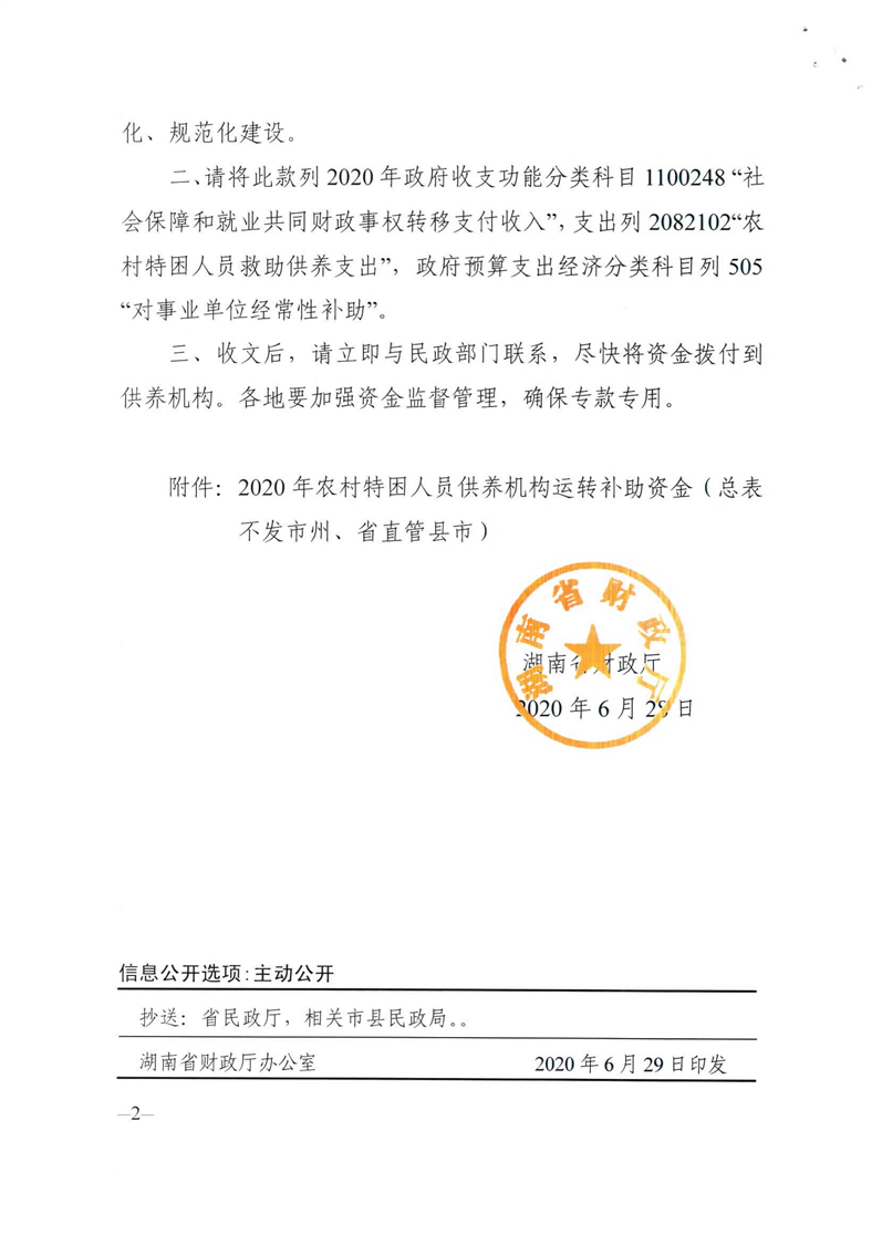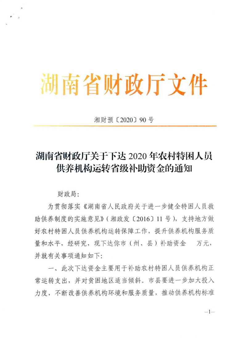湖南省财政厅关于下达2020年农村特困人员供养机构运转省级补助资金的通知