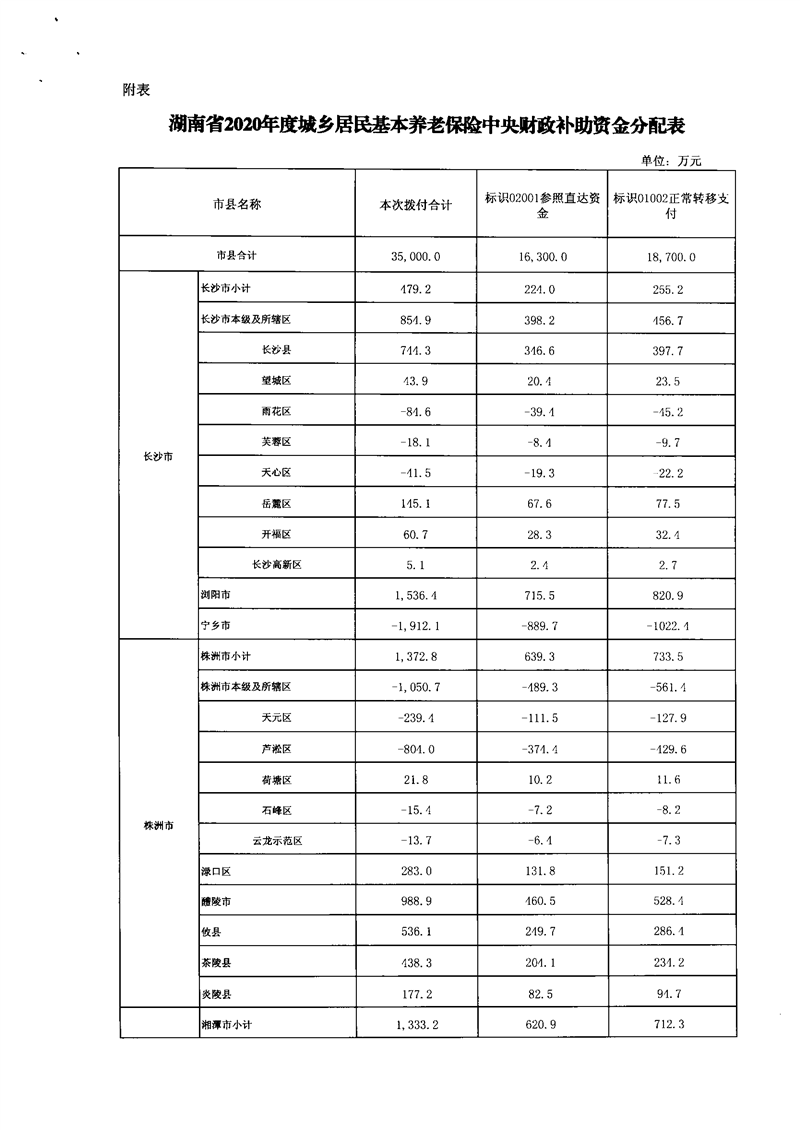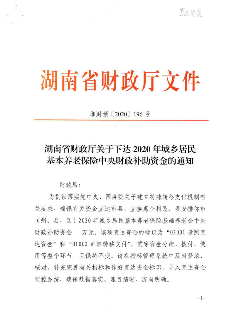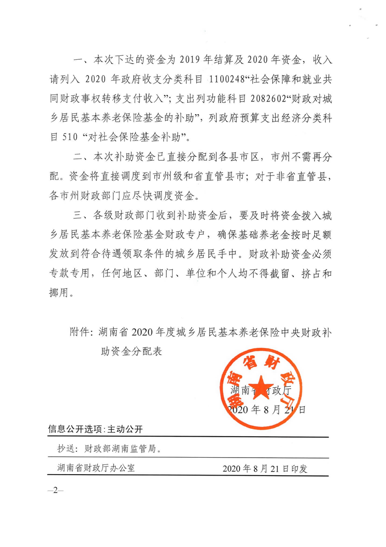 湖南省财政厅关于下达2020年城乡居民基本养老保险中央财政补助资金的 通知