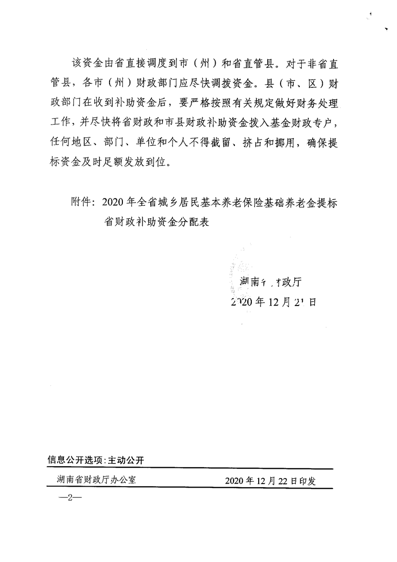 湖南省财政厅关于下达2020年城乡居民基本养老保险基础养老金提标省财政补助转移支付资金的通知