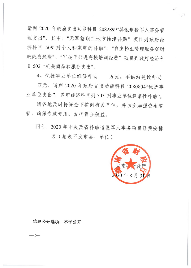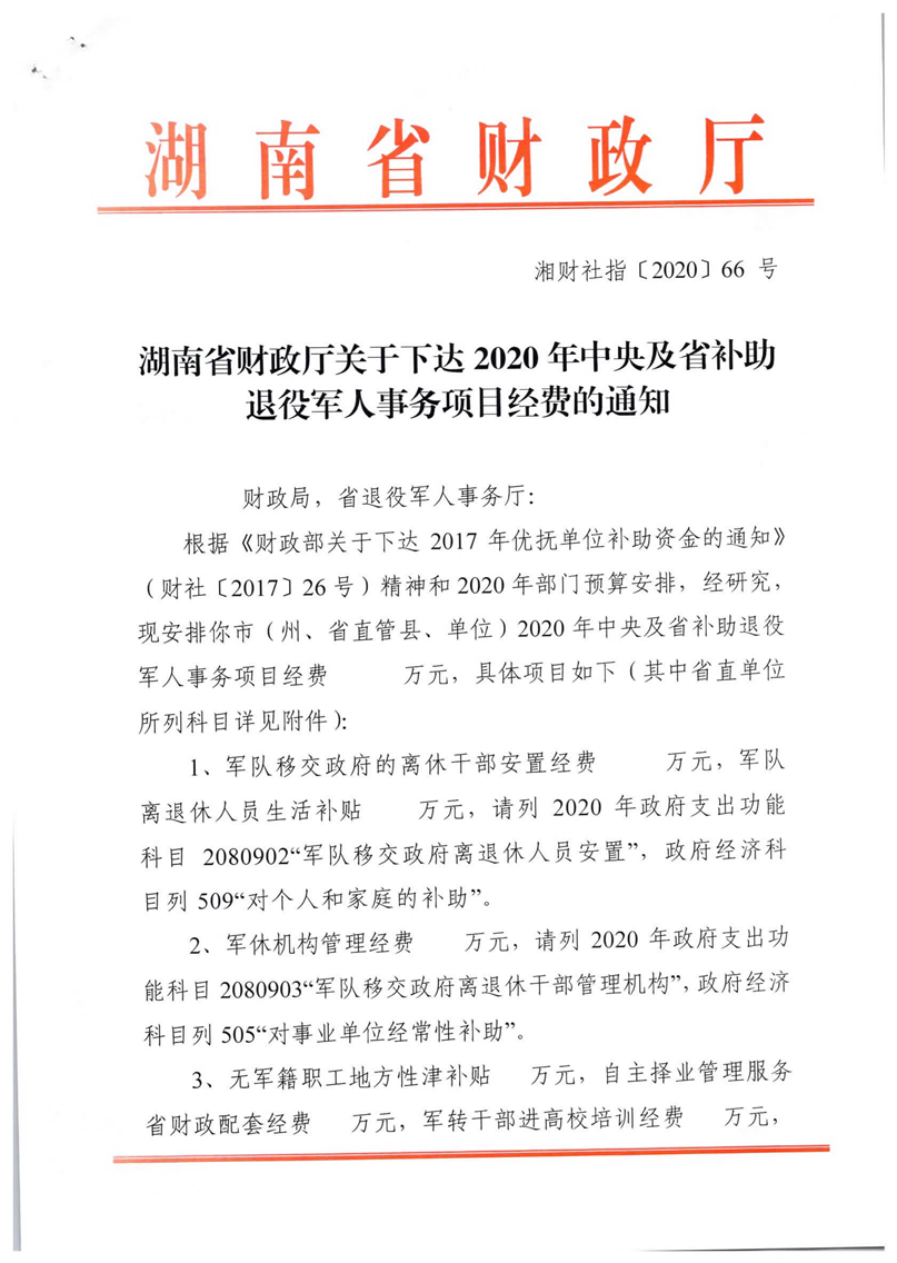 湖南省财政厅关于下达2020年中央及省补助退役军人事务项目经费的通知