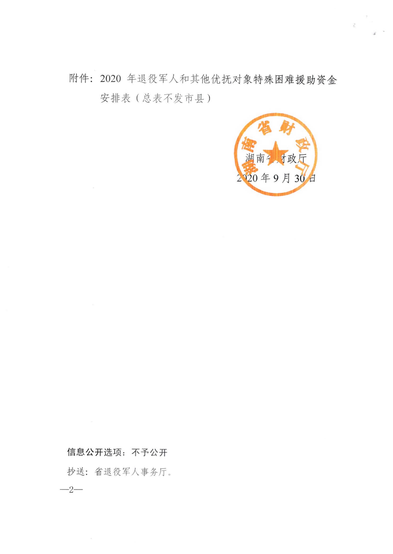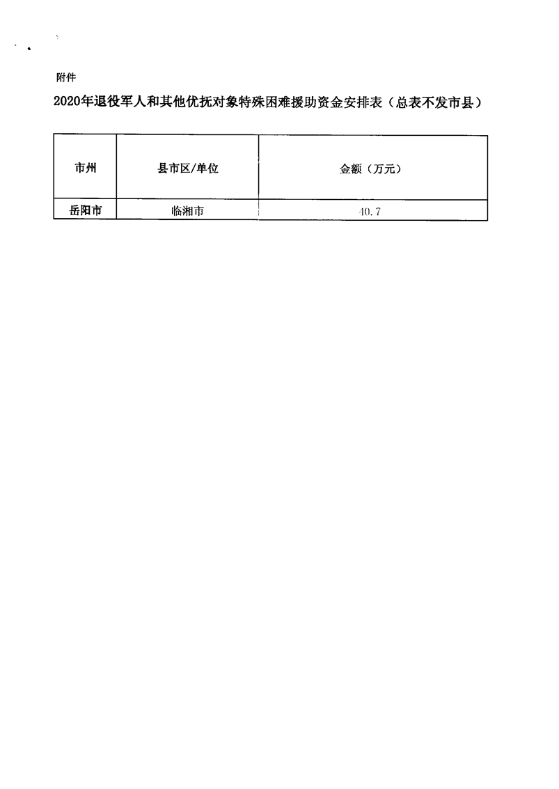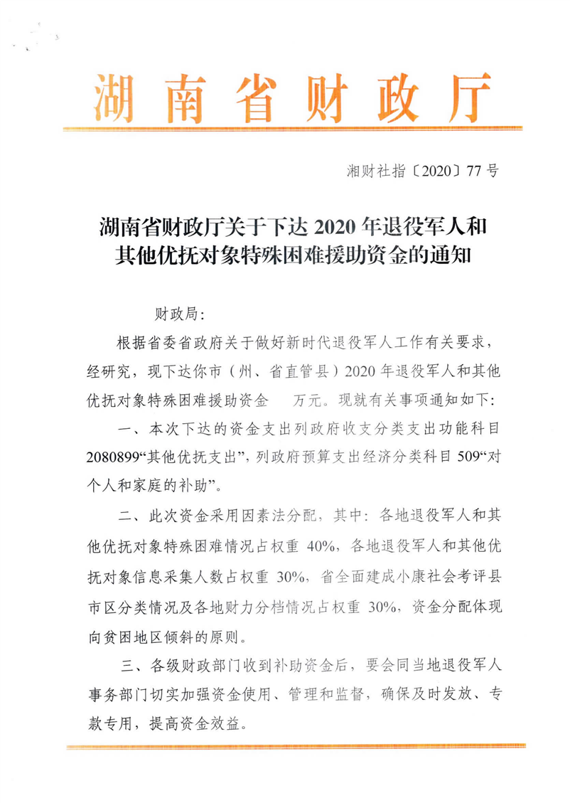 湖南省财政厅关于下达2020年退役军人和其他优抚对象特殊困难援助资金的通知