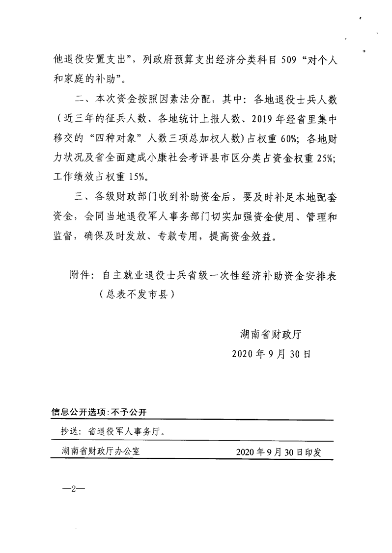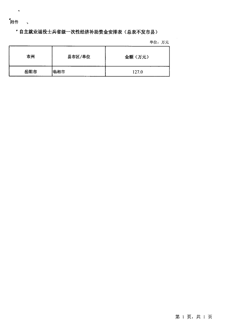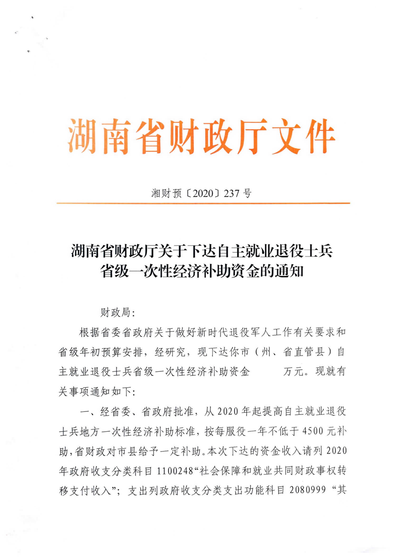 湖南省财政厅关于下达自主就业退役士兵省级一次性经济补助资金的通知