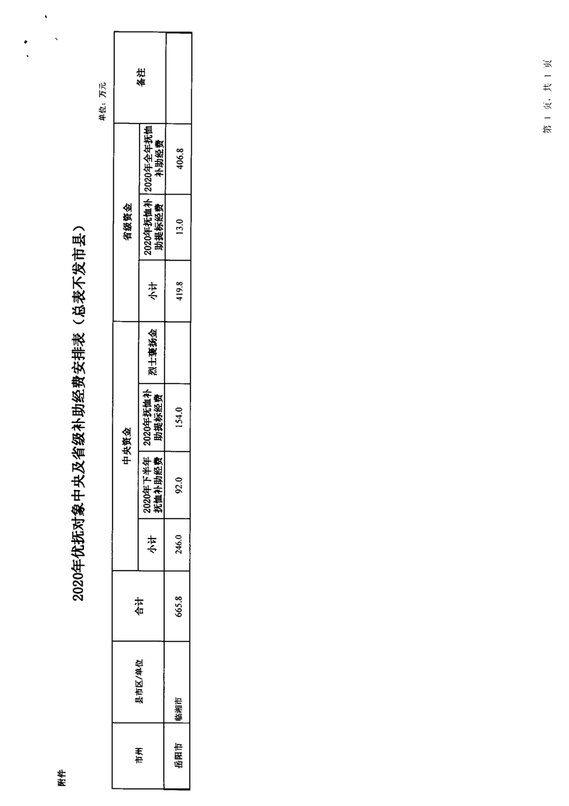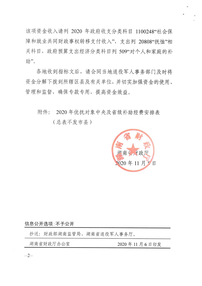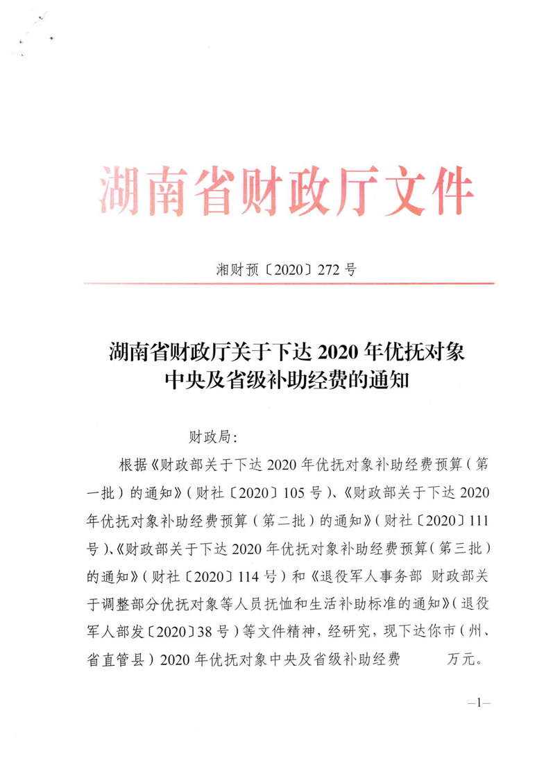 湖南省财政厅关于下达2020年优抚对象中央及省级补助经费的通知