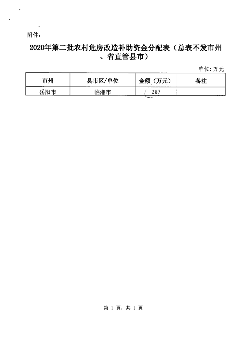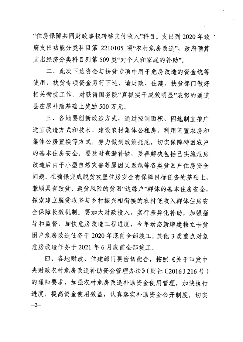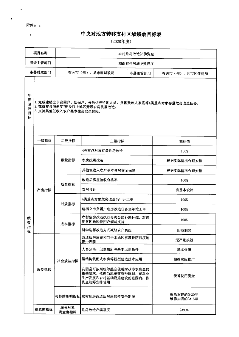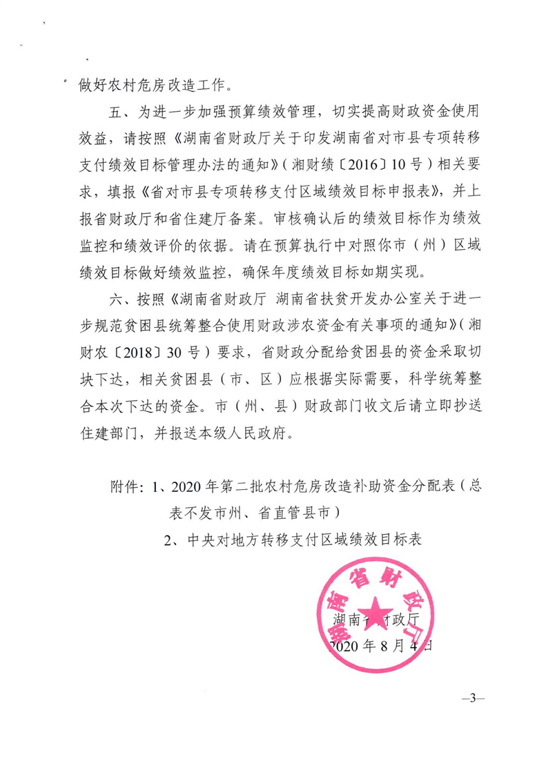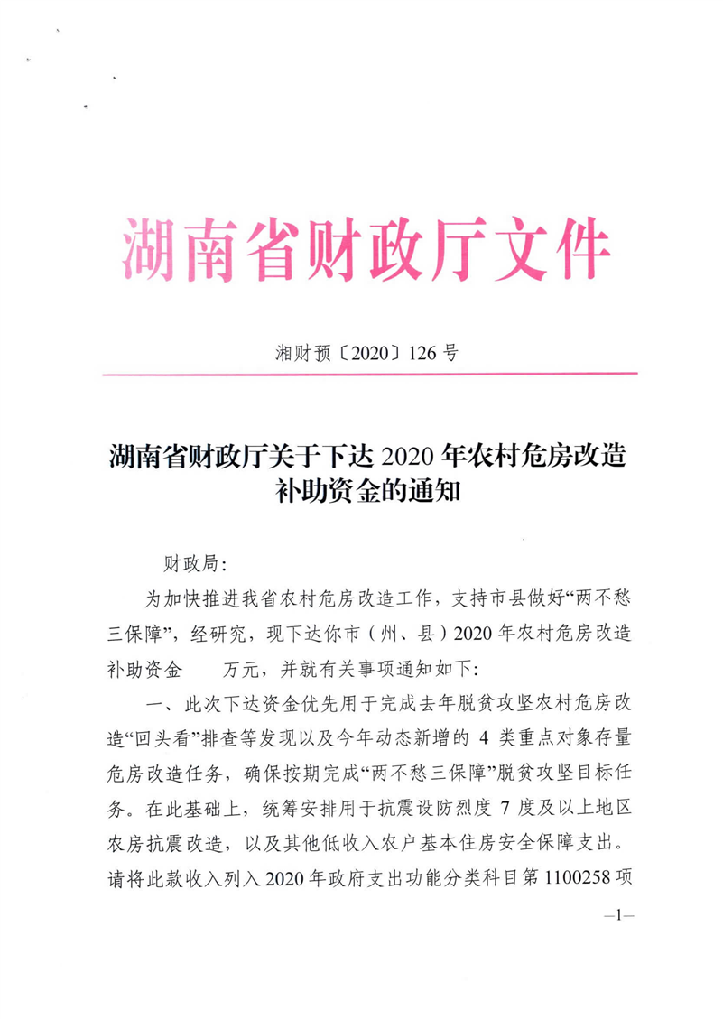 湖南省财政厅关于下达2020年农村危房改造补助资金的通知