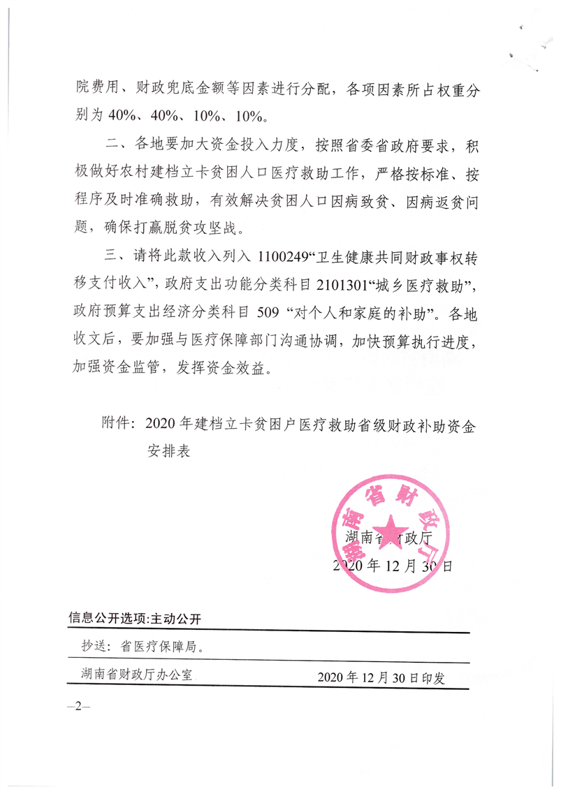 湖南省财政厅关于下达省补助2020年农村建档立卡贫困人口医疗救助资金的 通知