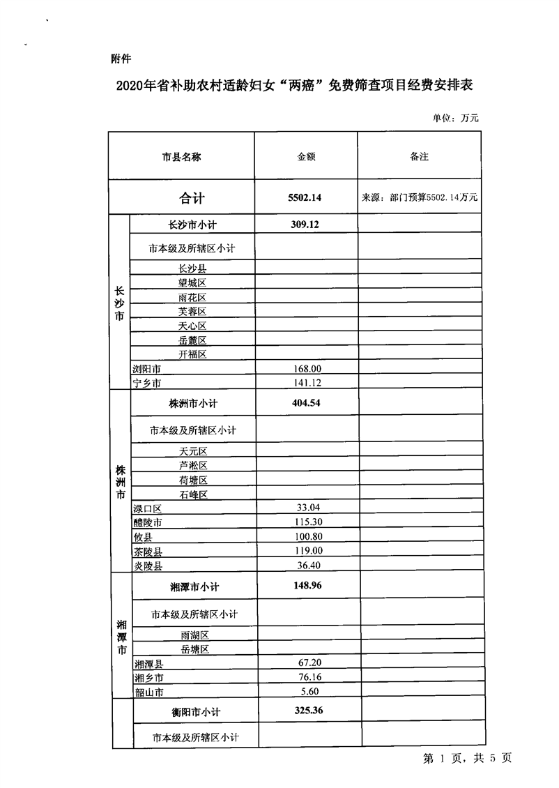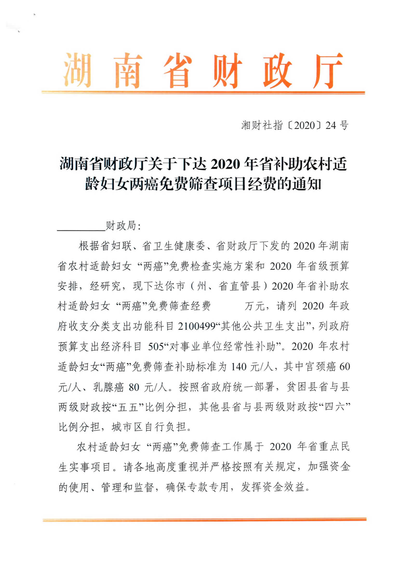 湖南省财政厅关于下达2020年省补助农村适龄妇女两癌免费筛查项目经费的通知