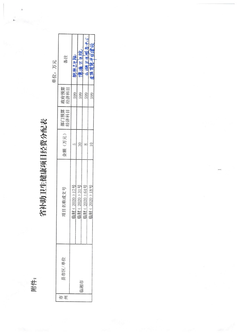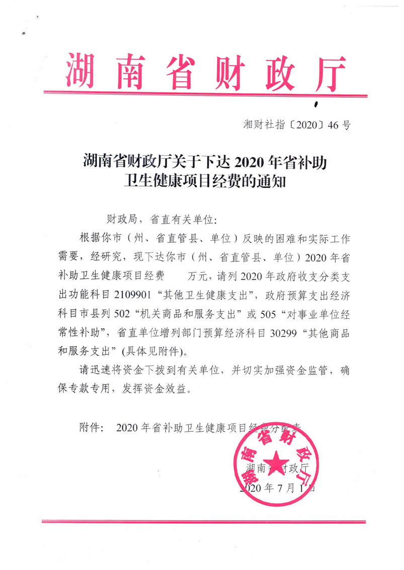 湖南省财政厅关于下达2020年省补助卫生健康项目经费的通知