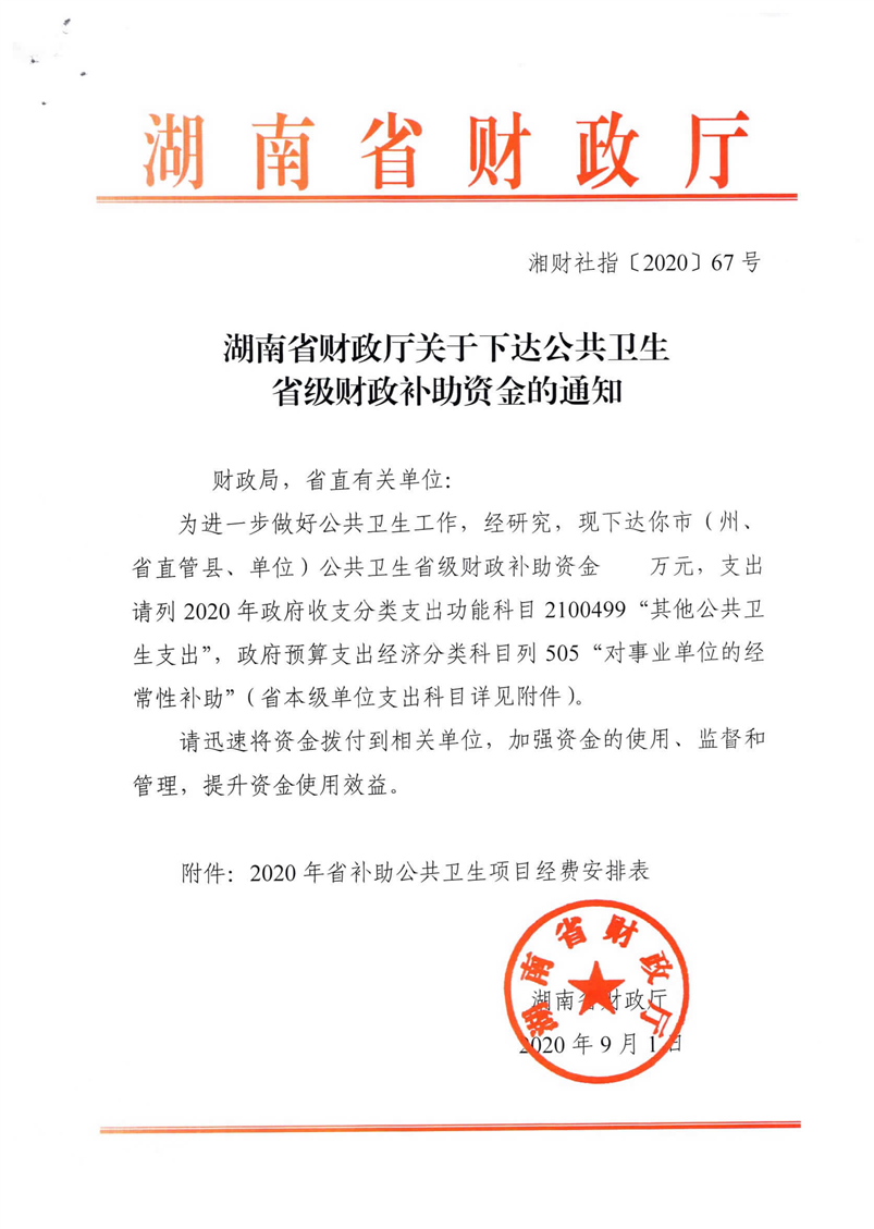 湖南省财政厅关于下达公共卫生省级财政补助资金的通知