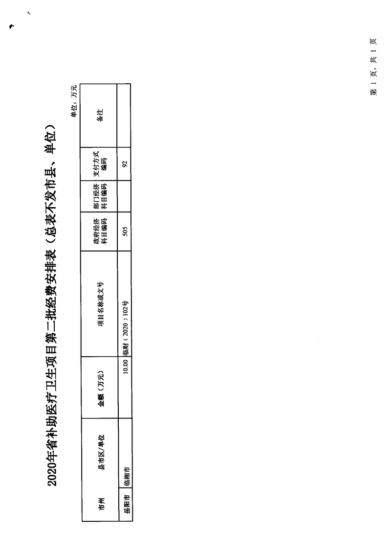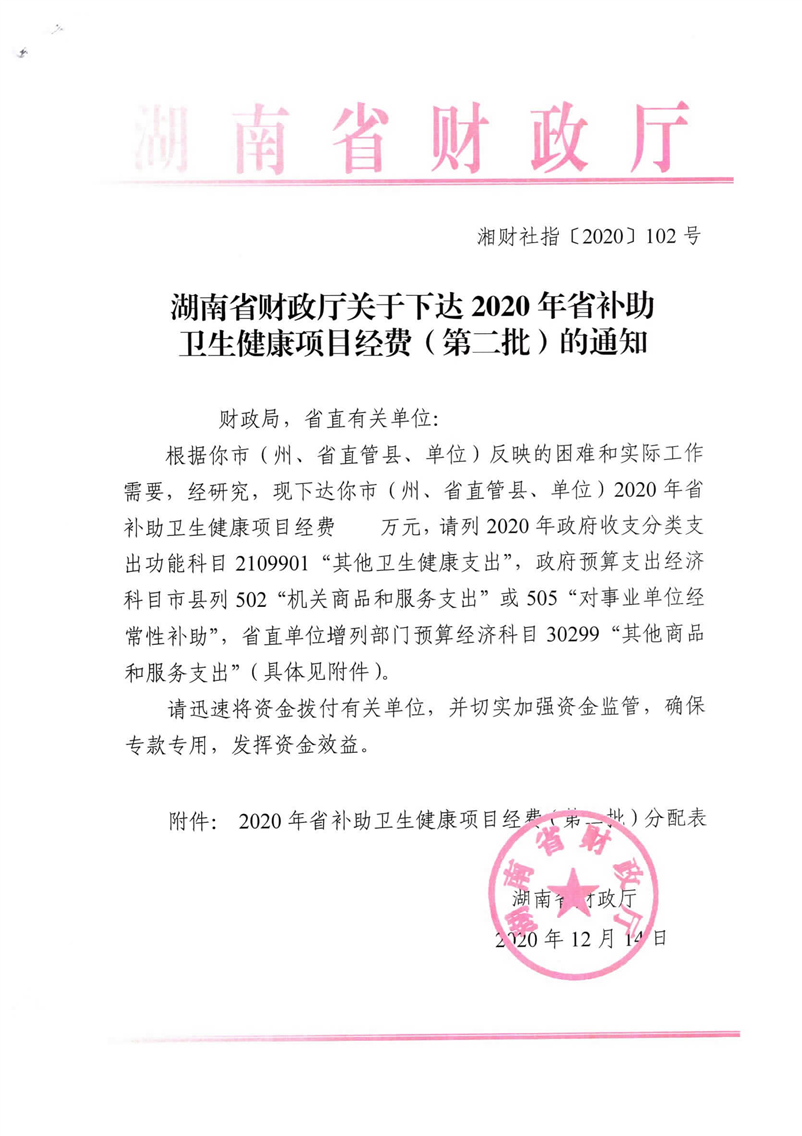 湖南省财政厅关于下达2020年省补助卫生健康项目经费(第二批)的通知