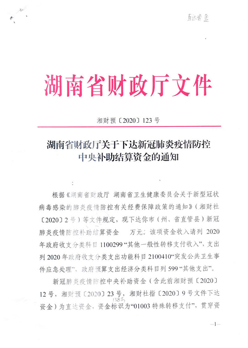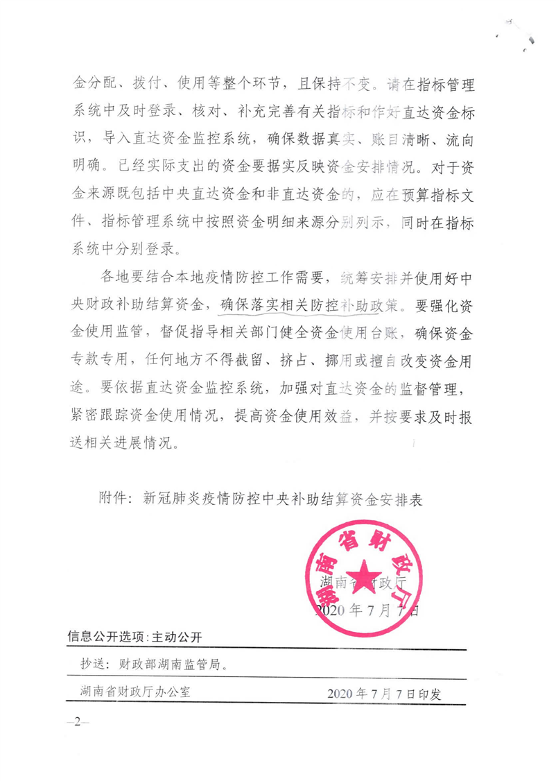 湖南省财政厅关于下达新冠肺炎疫情防控中央补助结算资金的通知