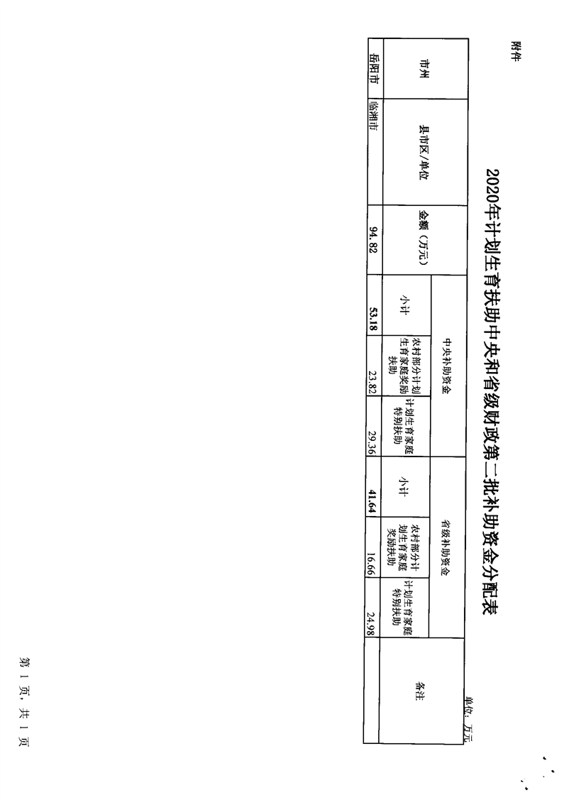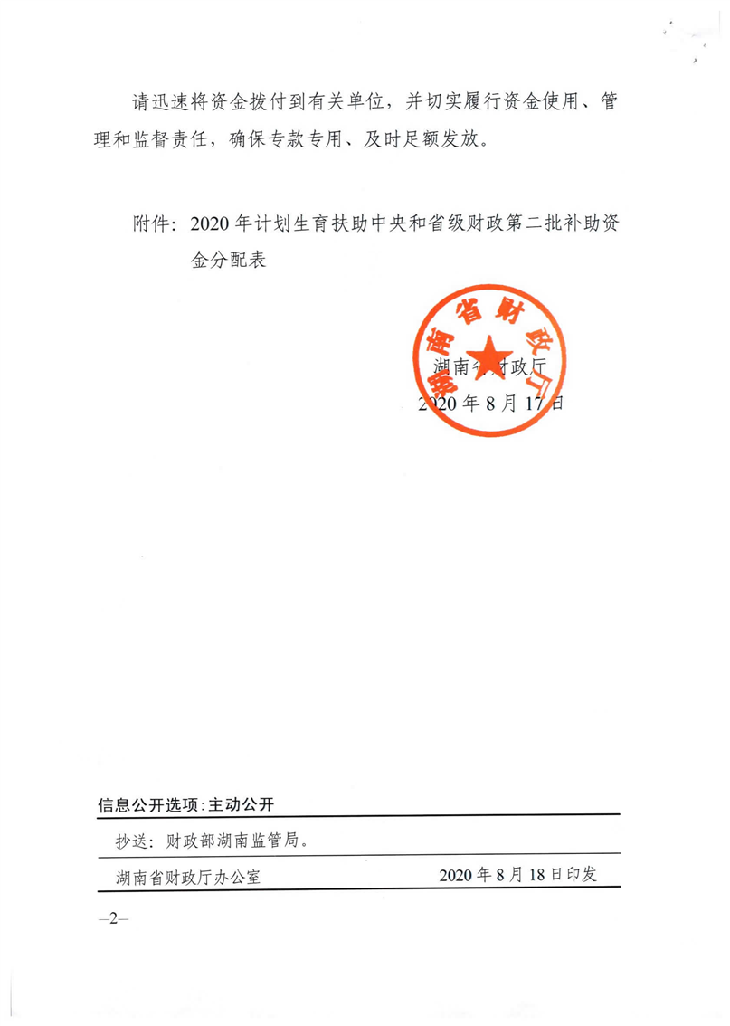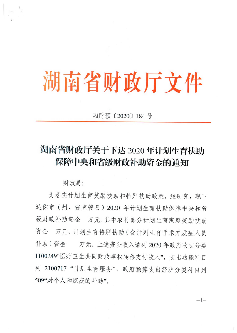 湖南省财政厅关于下达2020年计划生育扶助保障中央和省级财政补助资金的通知