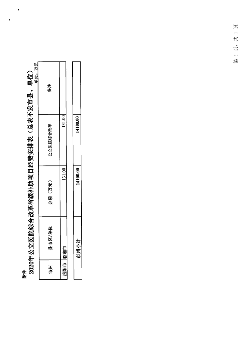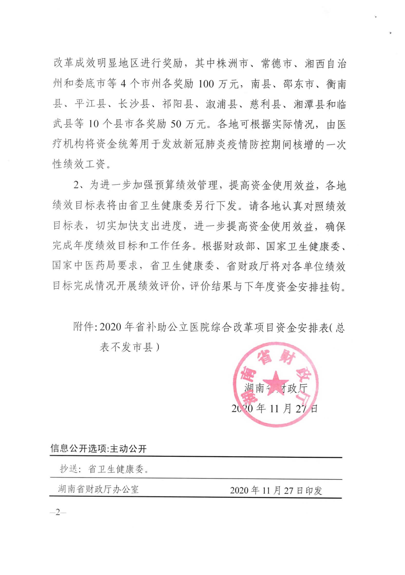 湖南省财政厅关于下达2020年省补助公立医院综合改革项目资金的通知