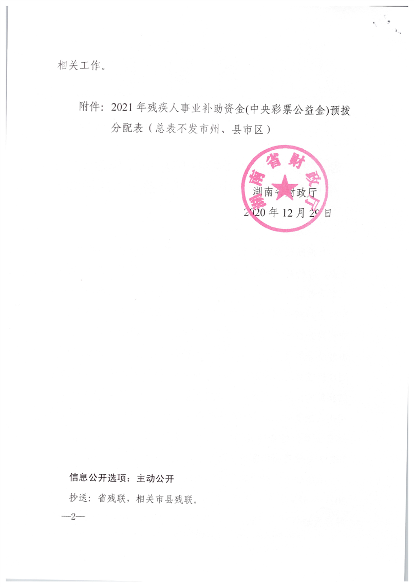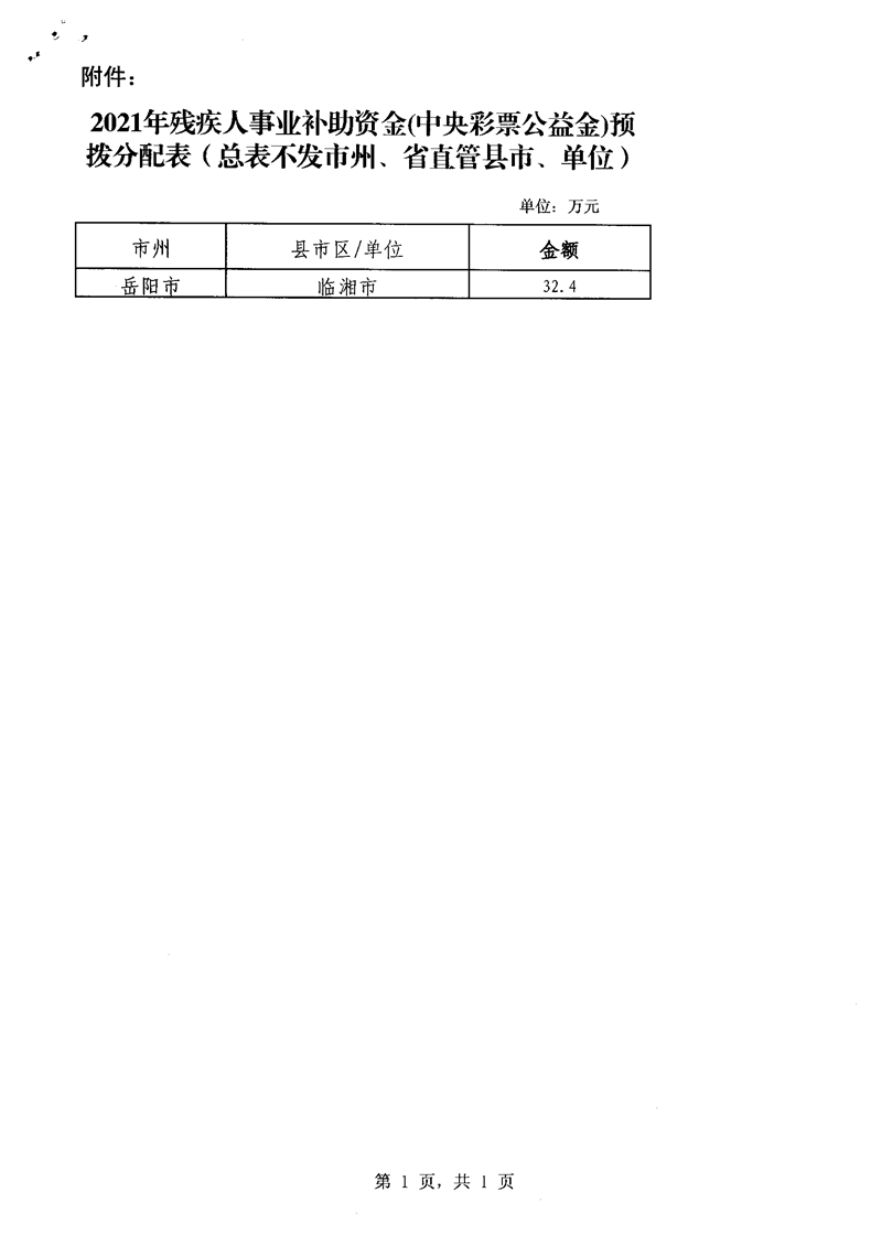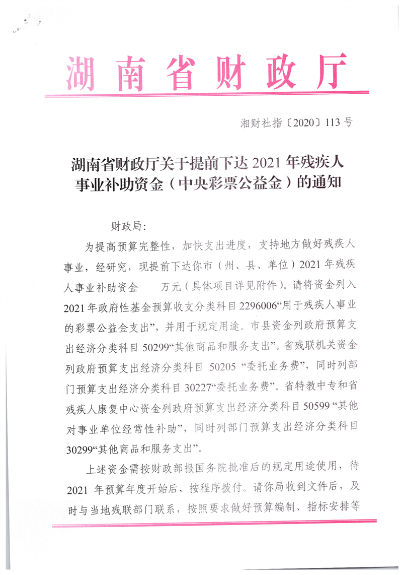 湖南省财政厅关于提前下达2021年残疾人事业补助资金(中央彩票公益金)的通知