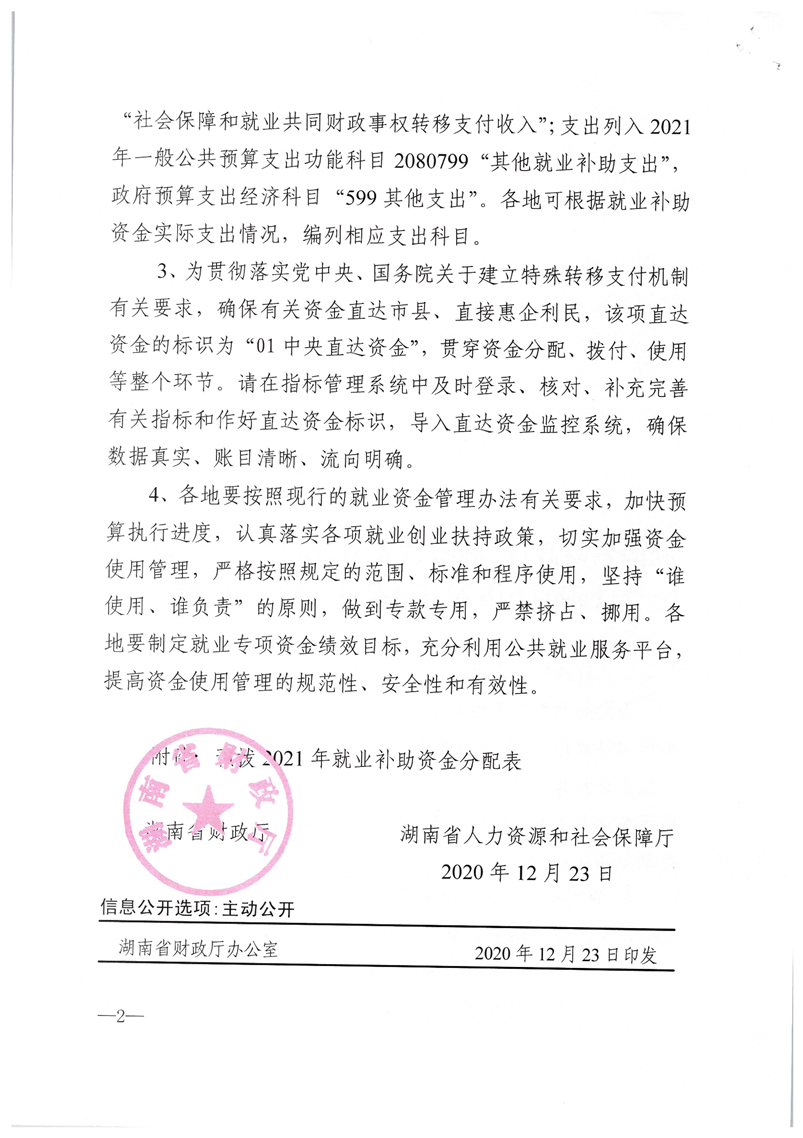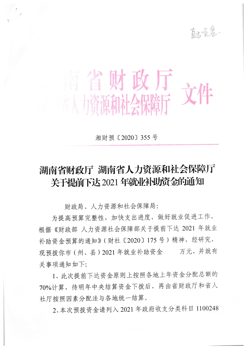 湖南省财政厅 湖南省人力资源和社会保障厅关于提前下达2021年就业补助资金的通知