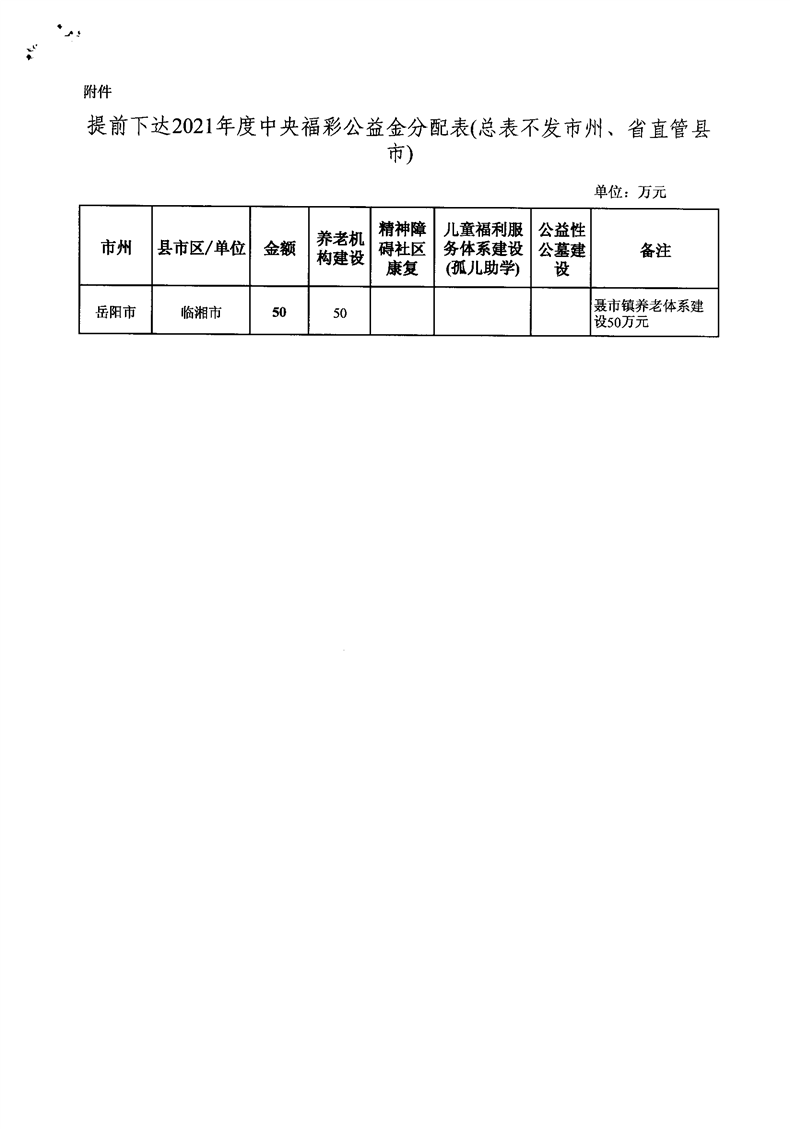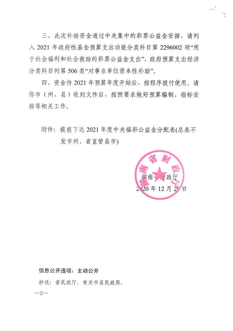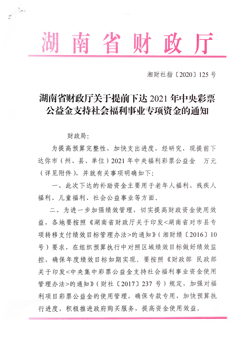 湖南省财政厅关于提前下达2021年中央彩票公益金支持社会福利事业专项资金的通知