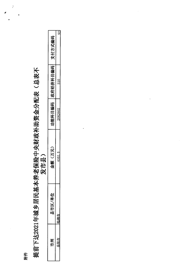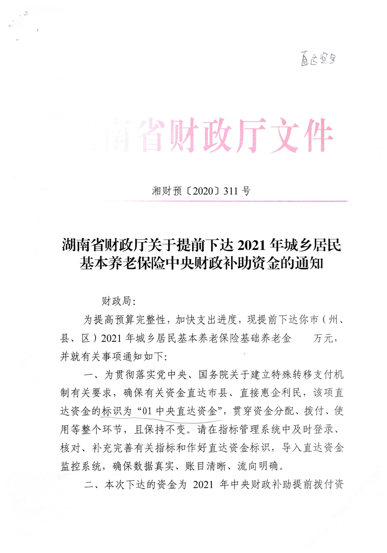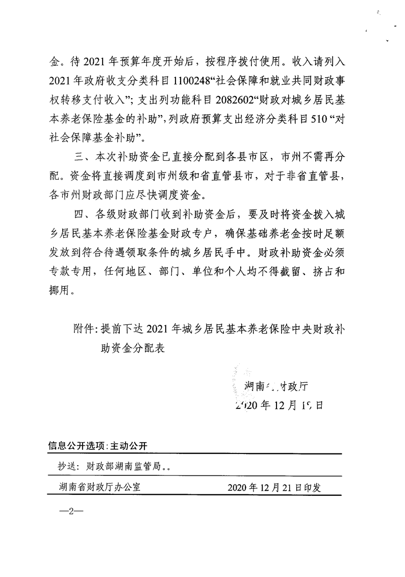 湖南省财政厅关于提前下达2021年城乡居民基本养老保险中央财政补助资金的通知