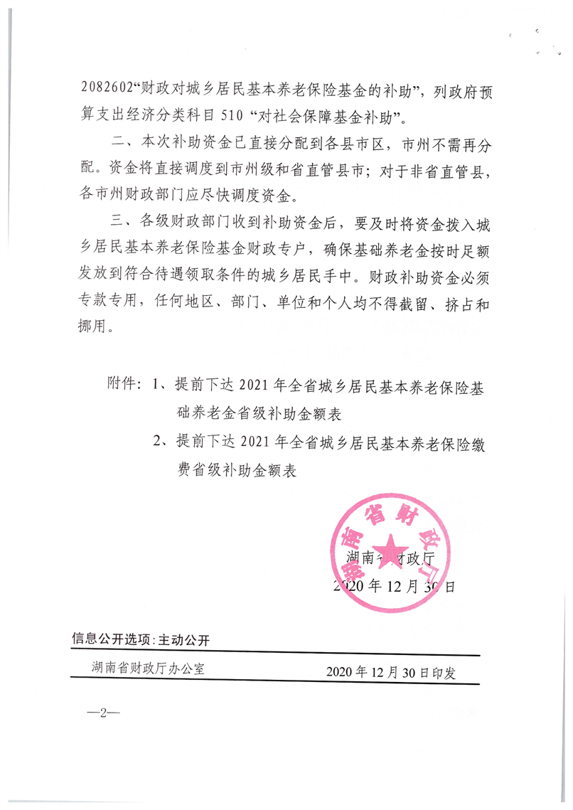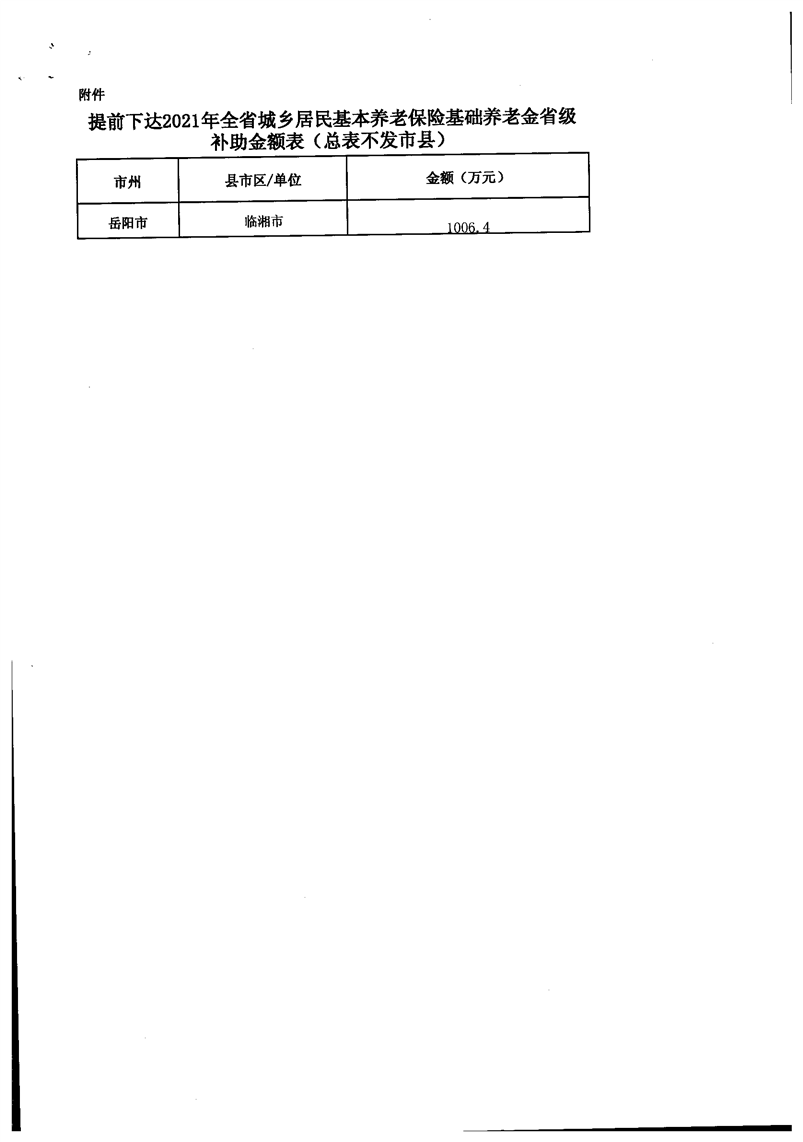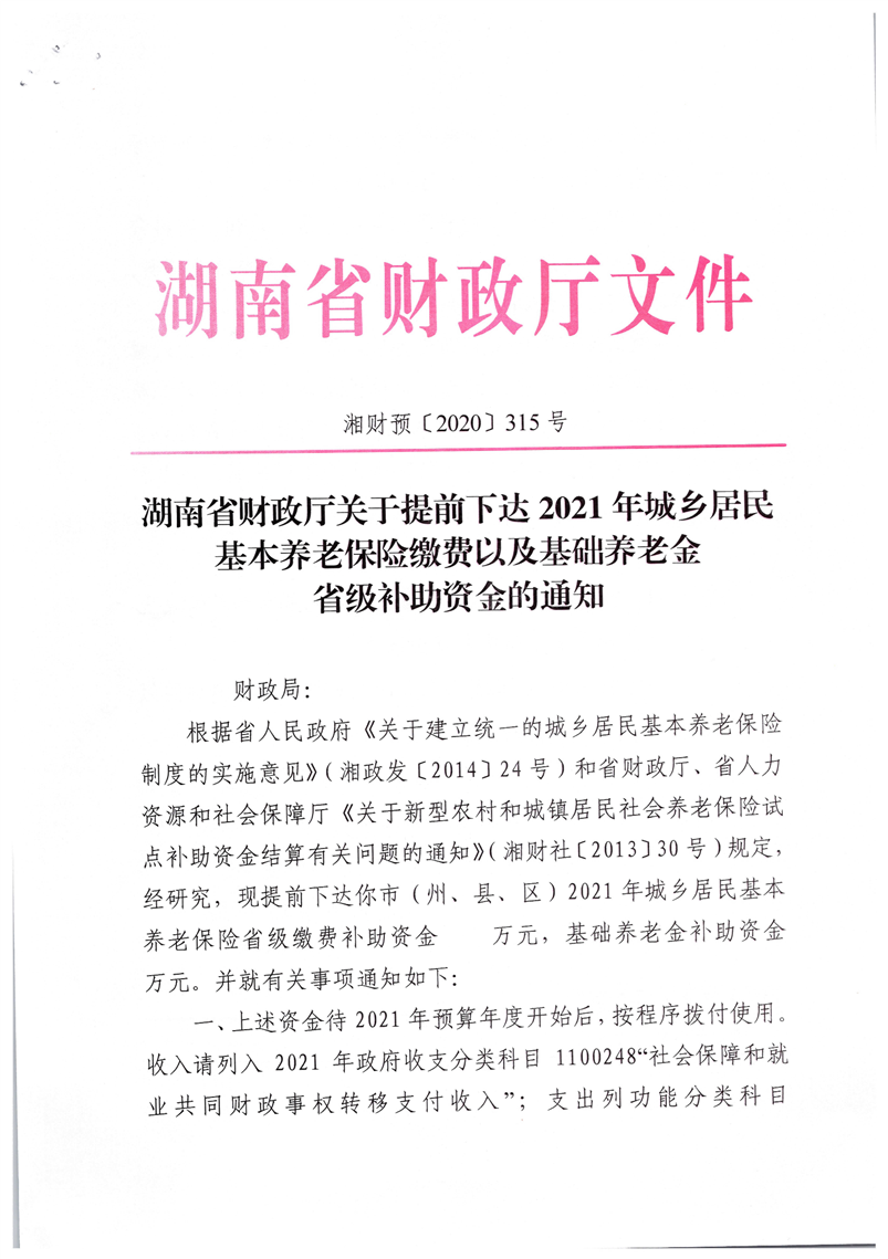 湖南省财政厅关于提前下达2021年城乡居民基本养老保险缴费以及基础养老金省级补助资金的通知