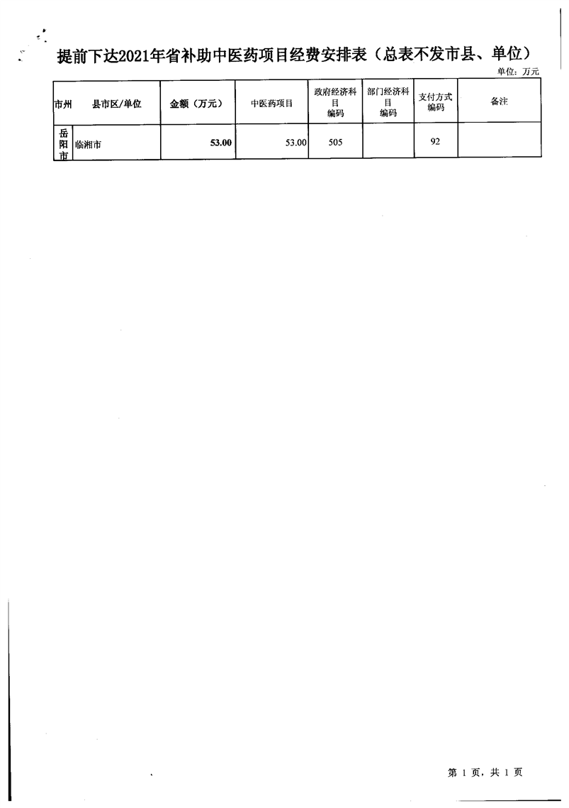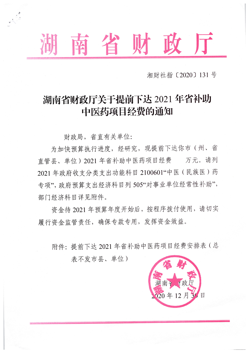 湖南省财政厅关于提前下达2021年省补助中医药项目经费的通知