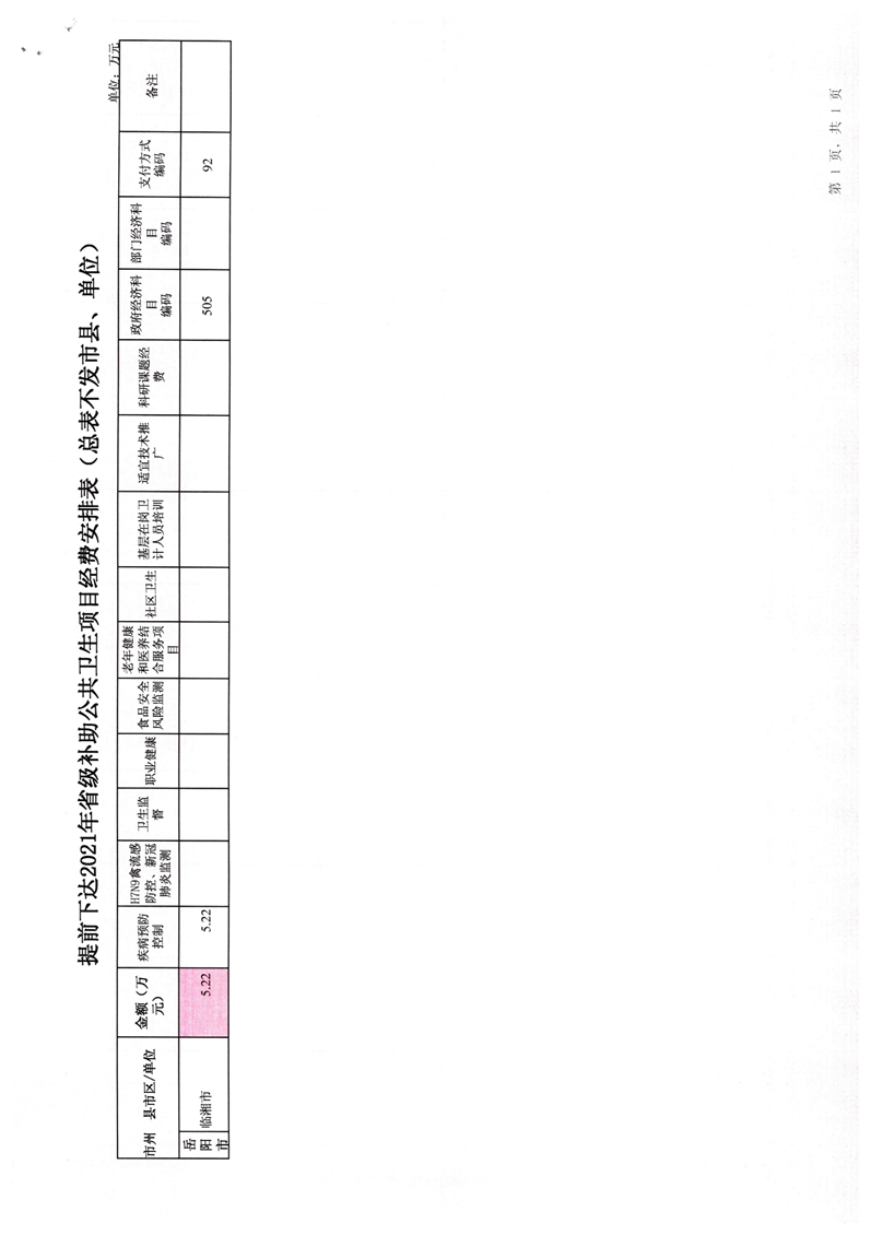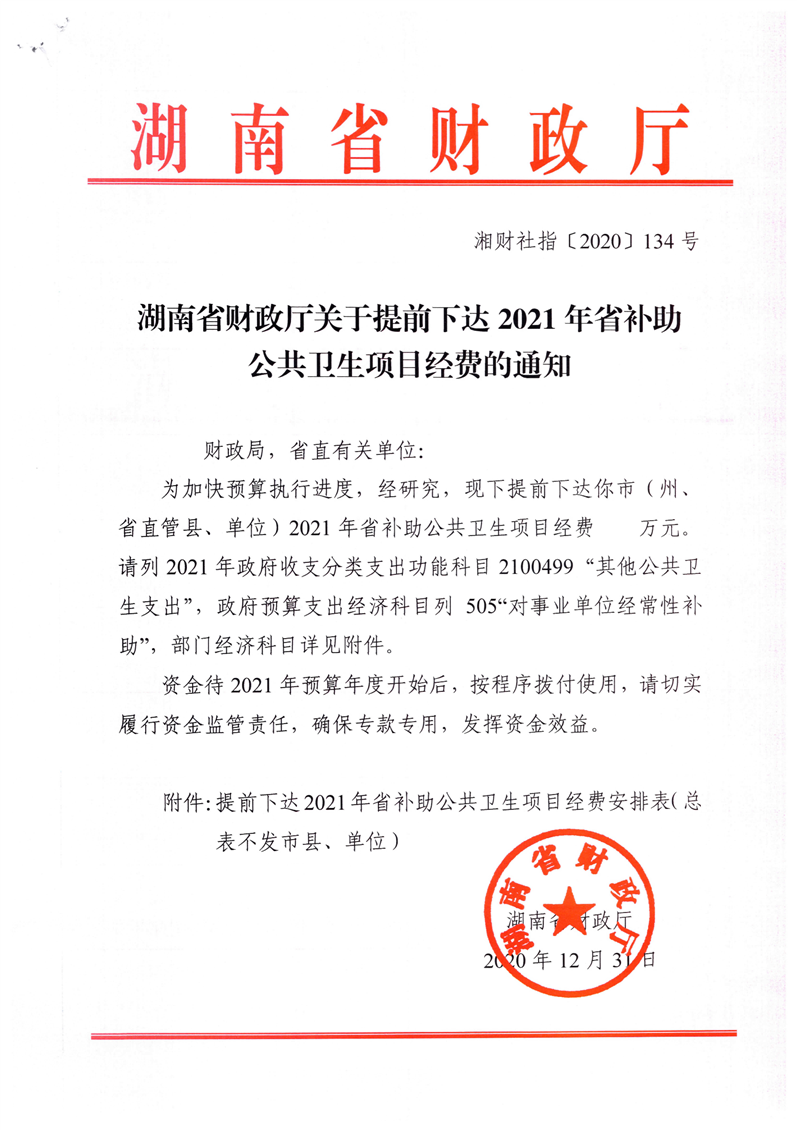 湖南省财政厅关于提前下达2021年省补助公共卫生项目经费的通知