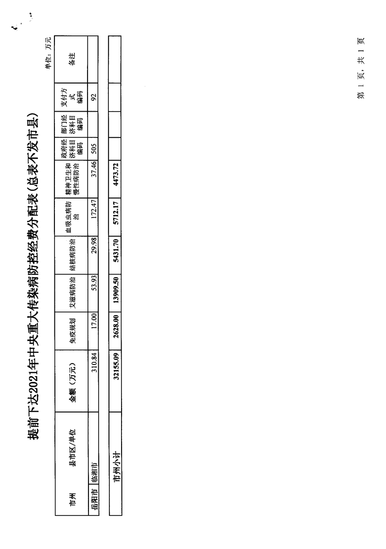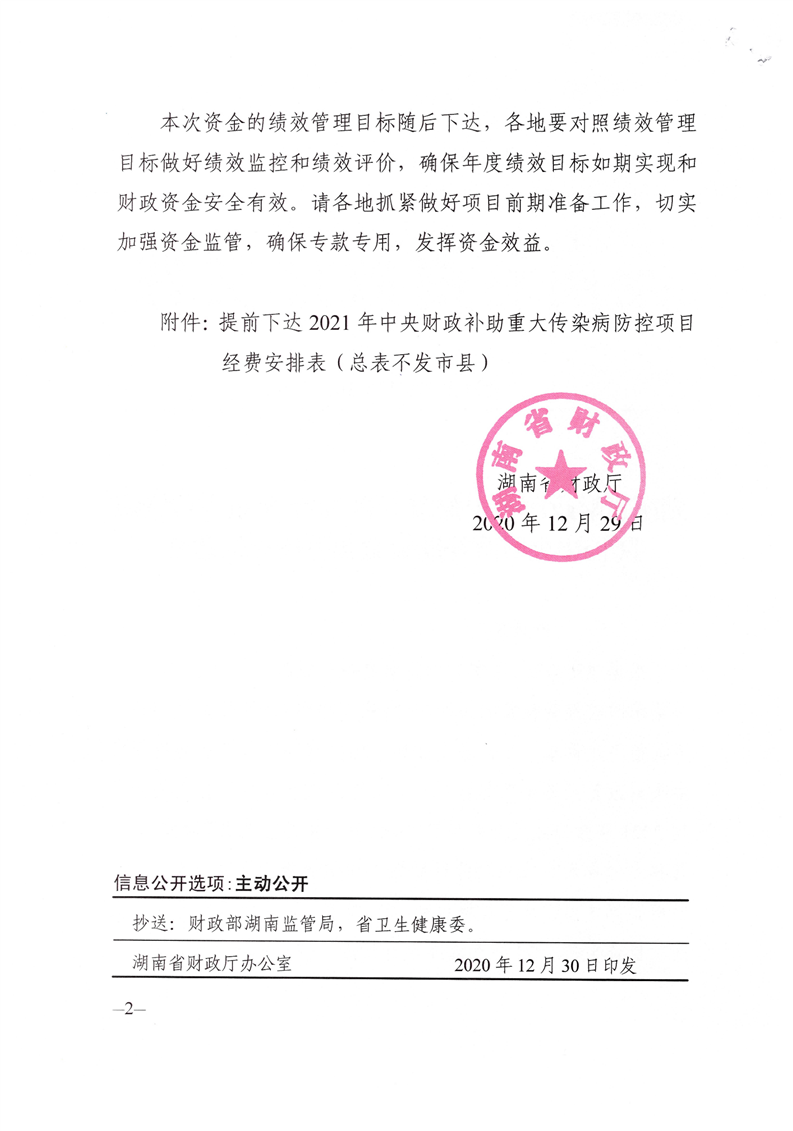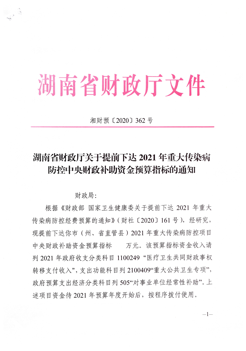 湖南省财政厅关于提前下达2021年重大传染病防控中央财政补助资金预算指标的通知