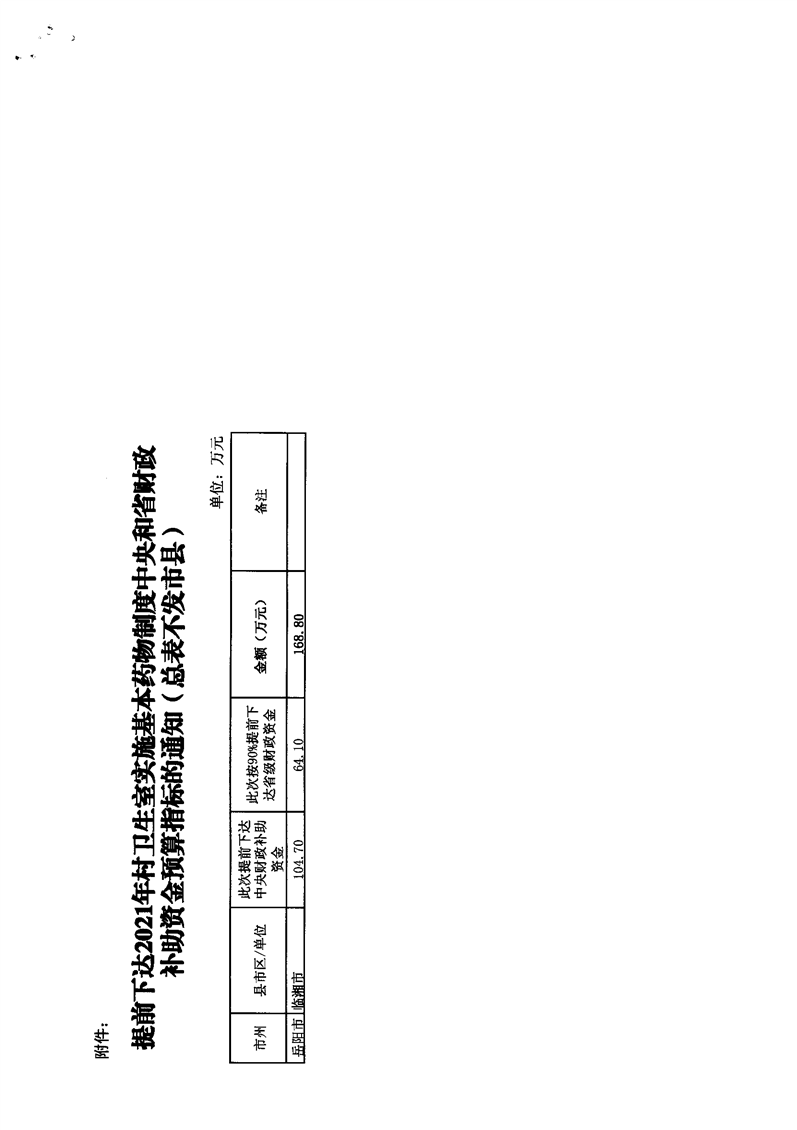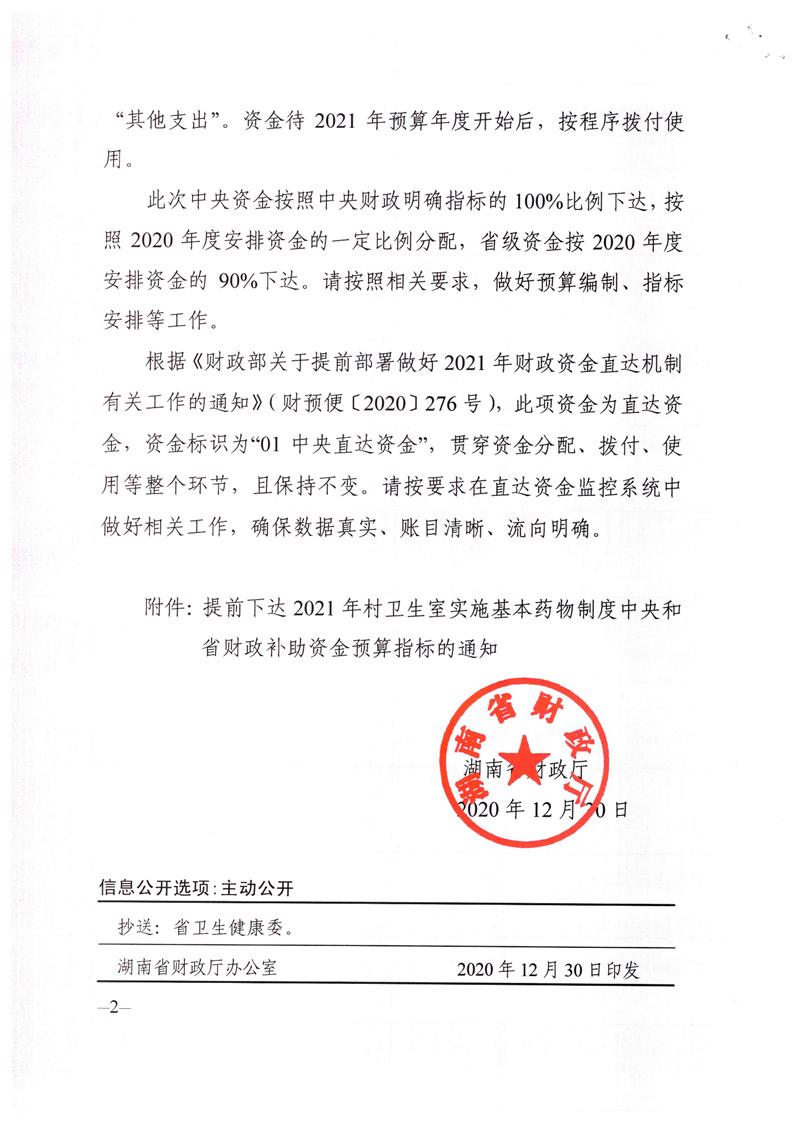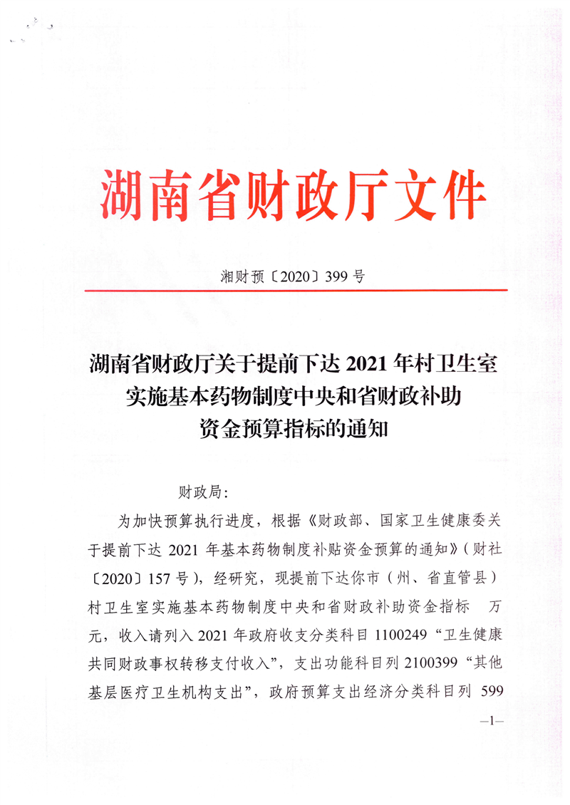 湖南省财政厅关于提前下达2021年村卫生室实施基本药物制度中央和省财政补助资金预算指标的通知