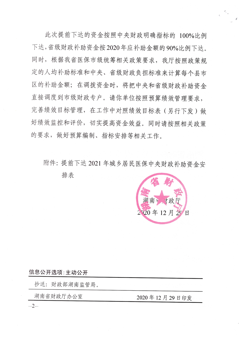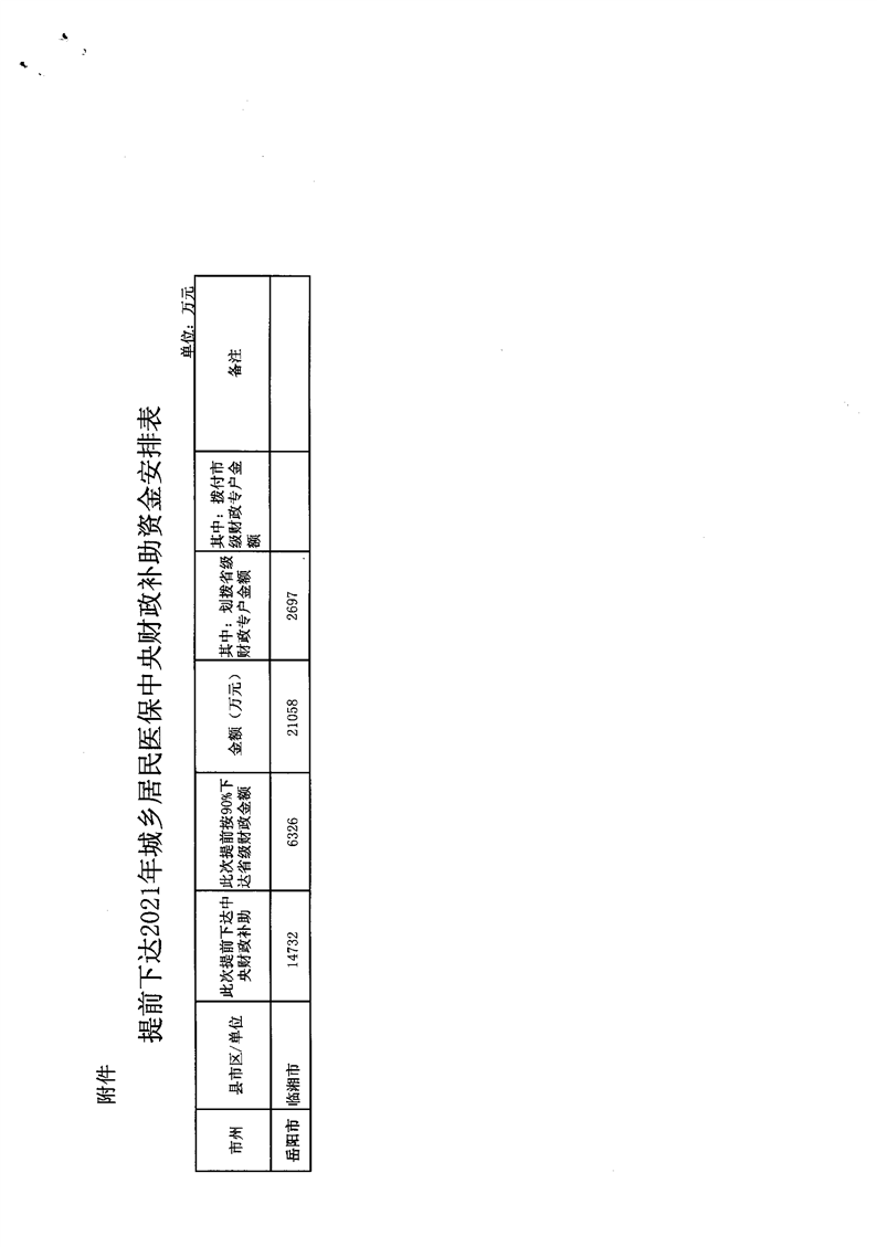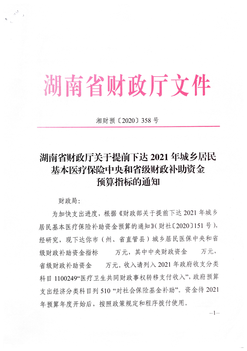 湖南省财政厅关于提前下达2021年城乡居民基本医疗保险中央和省级财政补助资金预算指标的通知