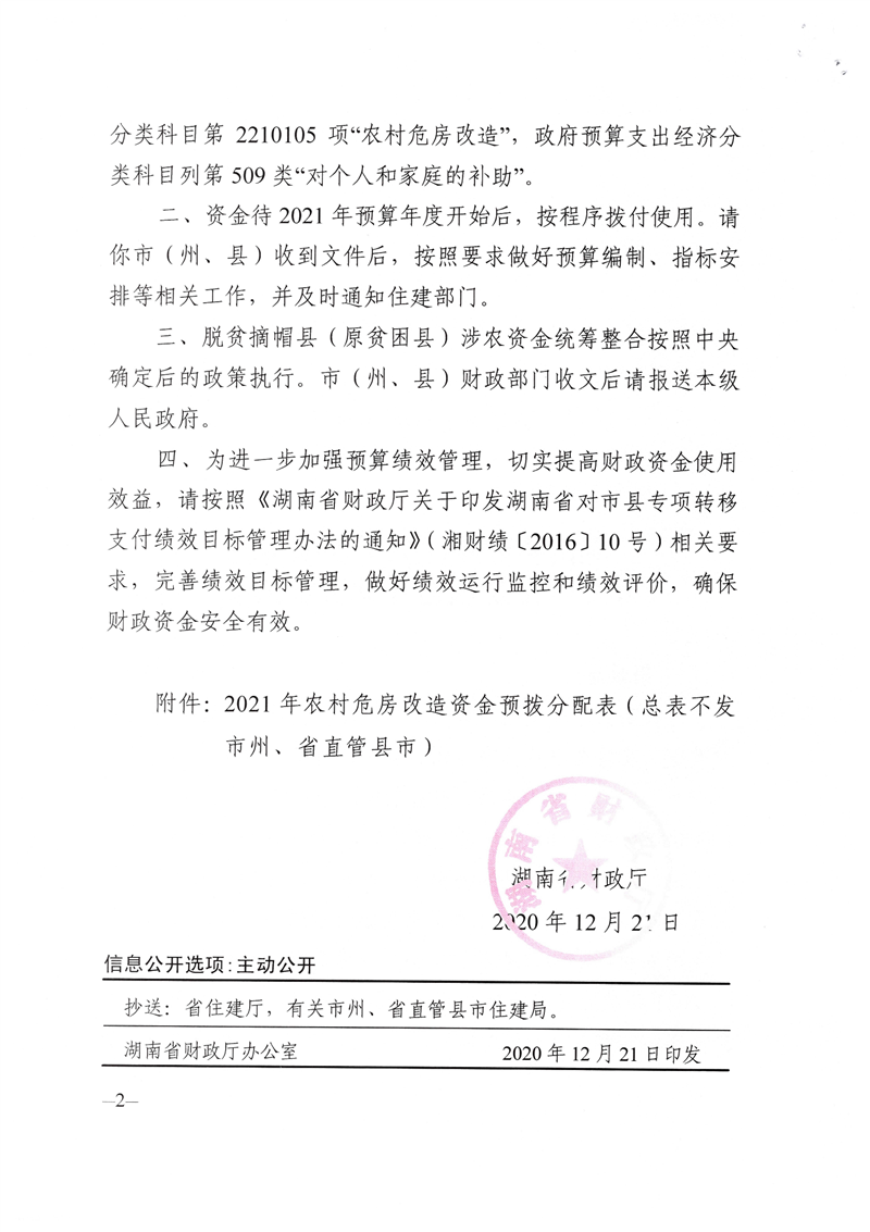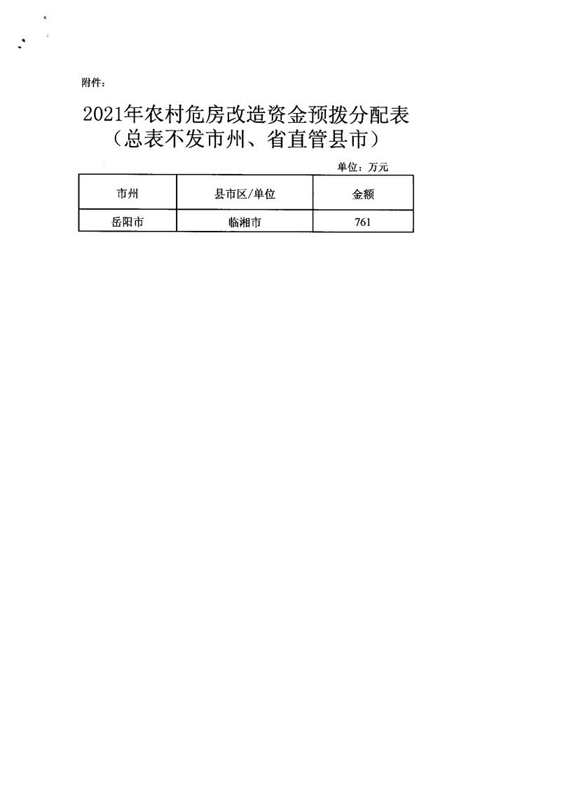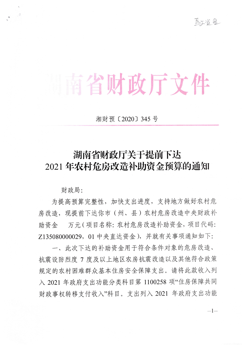 湖南省财政厅关于提前下达2021年农村危房改造补助资金预算的通知