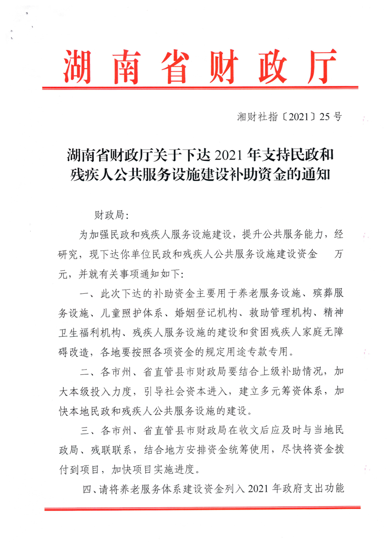 关于下达2021年支持民政和残疾人公共服务设施建设补助资金的通知