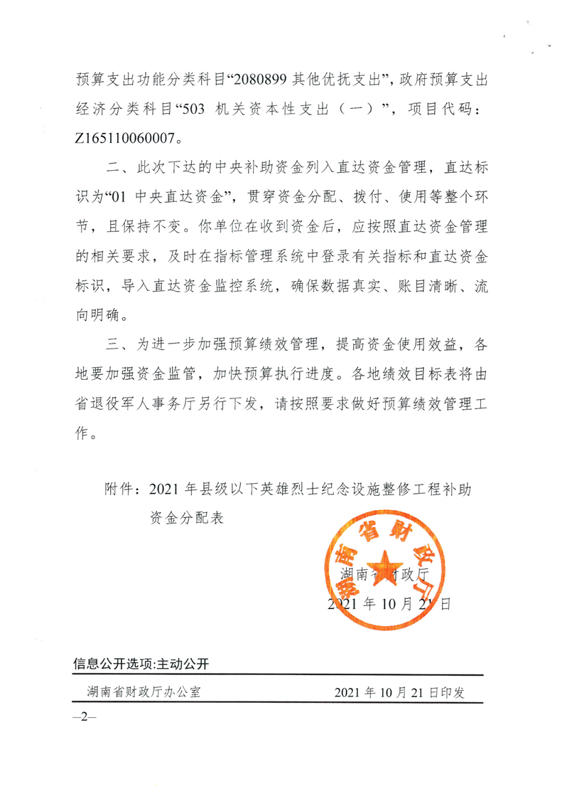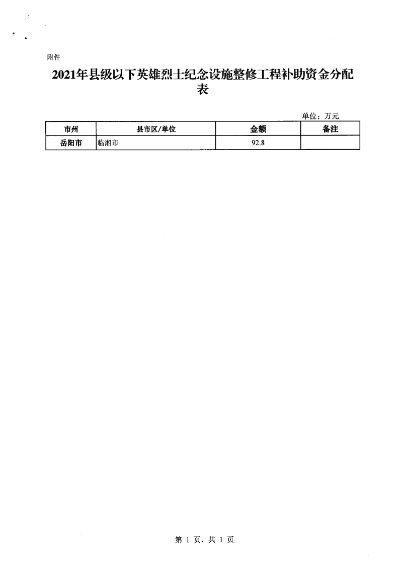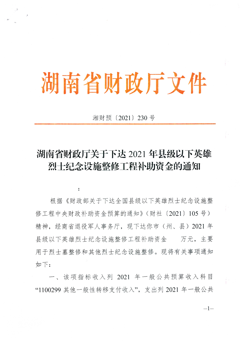 关于下达2021年县级以下英雄烈士纪念设施整修工程补助资金的通知