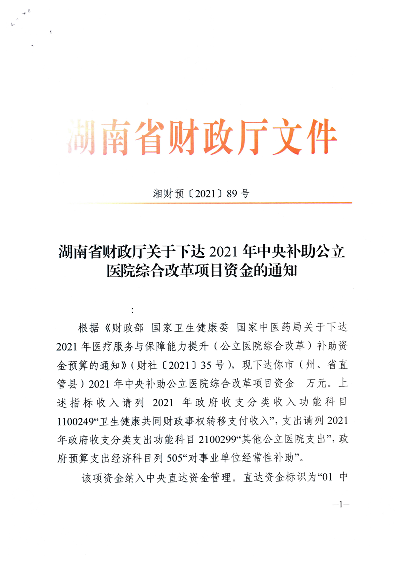 关于下达2021年中央补助公立医院综合改革项目资金的通知