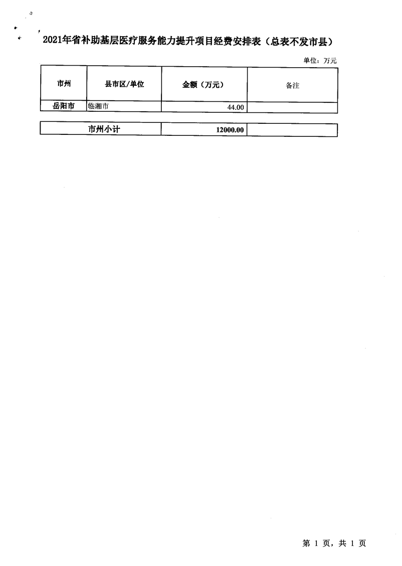 关于下达2021年省补助基层服务能力提升项目经费的通知