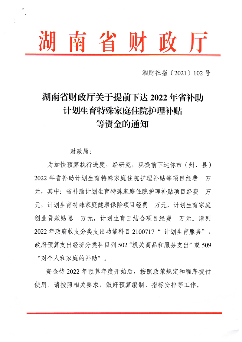 关于提前下达2022年补助计划生育特殊家庭住院护理补贴等资金的通知